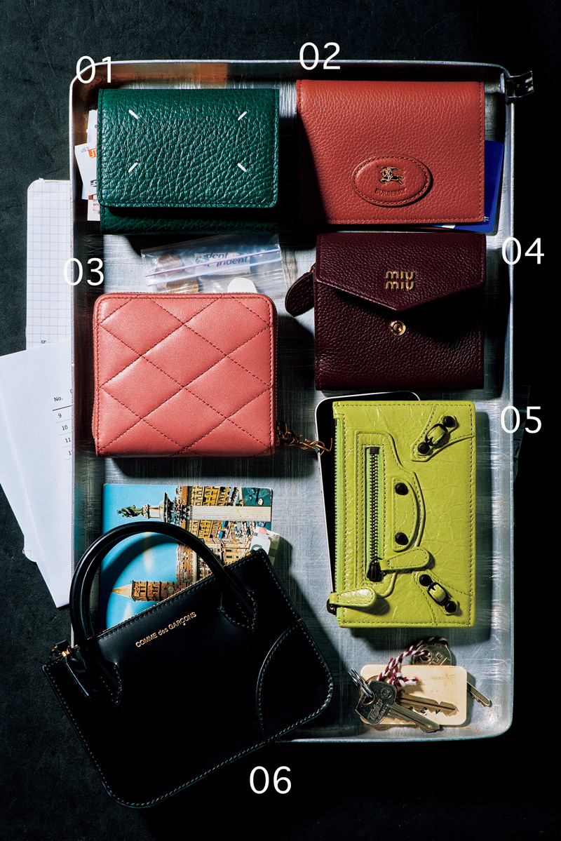 01_メゾンの象徴である4 本の白いステッチが施された、ジップ付きの3 つ折りウォレット。深みのあるグリーンは、2026年春夏「アヴァン・プルミエール」コレクションより仲間に加わったばかり。[ H8×W10.5cm ]¥79200 / Maison Margiela(マルジェラ ジャパン クライアントサービス)、02_メトロで拾得したのは、グレイニーカーフレザーでできた2 つ折りのカードケース。フロントには「馬上の騎士」デザインのレザーパッチを配し、カードを4 枚収納できる内面には「バーバリーチェック」が施されている。[H8× W10 × D3cm ]¥57200/Burberry(バーバリー・ジャパン)、03_春らしいチューリップピンクに、エレガントなダイヤモンドキルティング。《サンローラン》の新ウォレットライン「カサンドラビジュー」の目を引くコレクション。ロゴを象ったチャームも素敵。[H9×W10.5cm ]¥123200 / Saint Laurent by Anthony Vaccarello(サンローラン クライアントサービス)、04_上品な《ミュウミュウ》の3つ折りウォレットは、コンパクトながら収納たっぷり。札入れにカードスロットが3 つ、ドキュメントポケットが3 つ、ジップのコインパースを搭載した、使い勝手のいい仕上がり。[ H8 ×W9cm ]¥88000(予定価格)/MIU MIU(ミュウミュウ クライアントサービス)、05_スマートフォンと一緒に忘れられたコイン&カードホルダー。アイコンバッグ「ル・シティ」のディテールをミニサイズで再現。2つのジップポケットと、背面に5つのカードスロットを備えている。[ H8 ×W13.5 ×D1.5cm ]¥60500(予定価格)/ BALENCIAGA(バレンシアガ クライアントサービス)、06_ハンドバッグを思わせるポーチは、《ウォレット・コム デ ギャルソン》らしい、遊び心が詰まっている。「ハンドルズ」のモデル名の通り、2 つのハンドル付きで、アクセサリー感覚で持ち歩ける。[ H10.5× W14cm ]¥39050/Wallet COMME des GARÇONS(コム デ ギャルソン)
