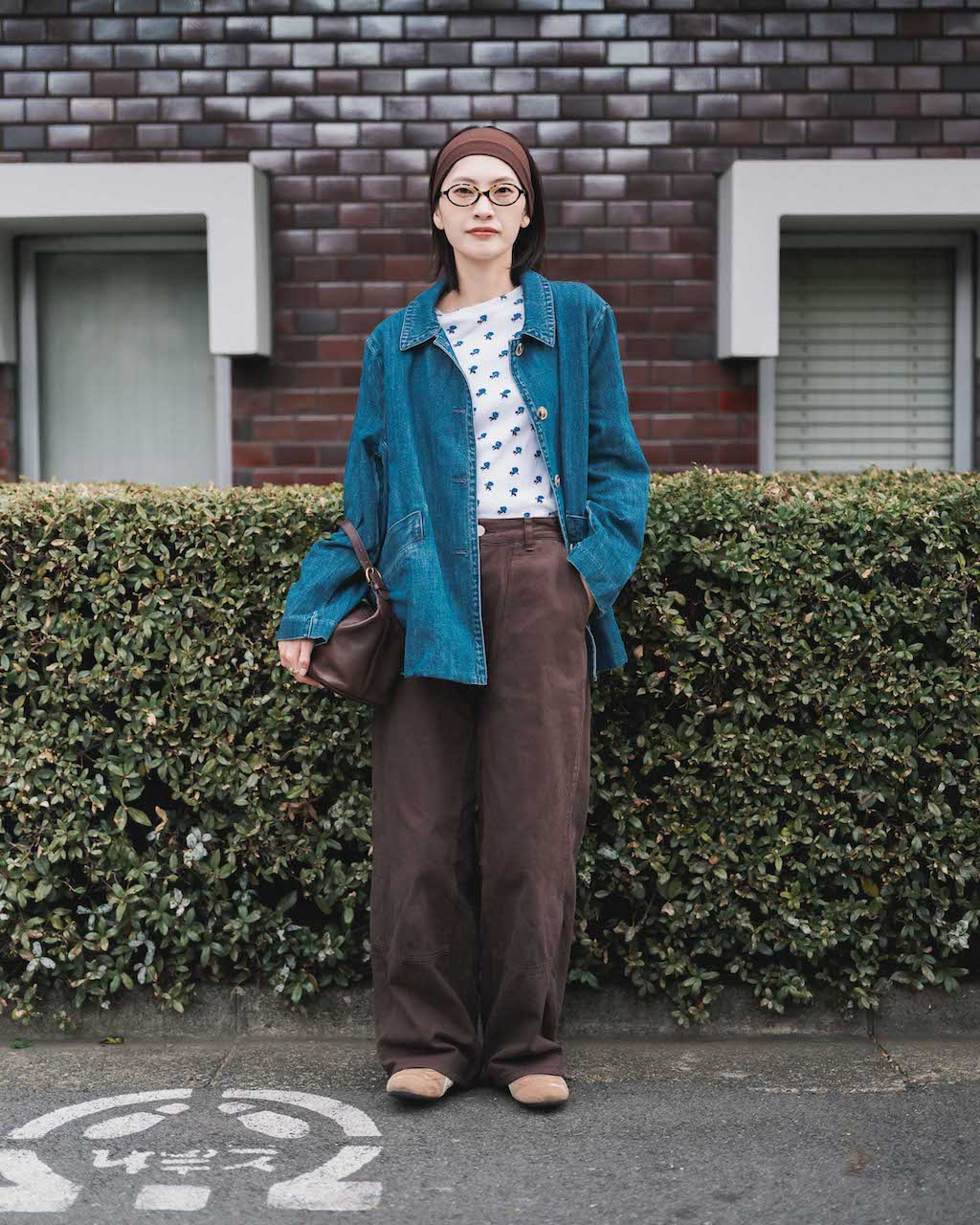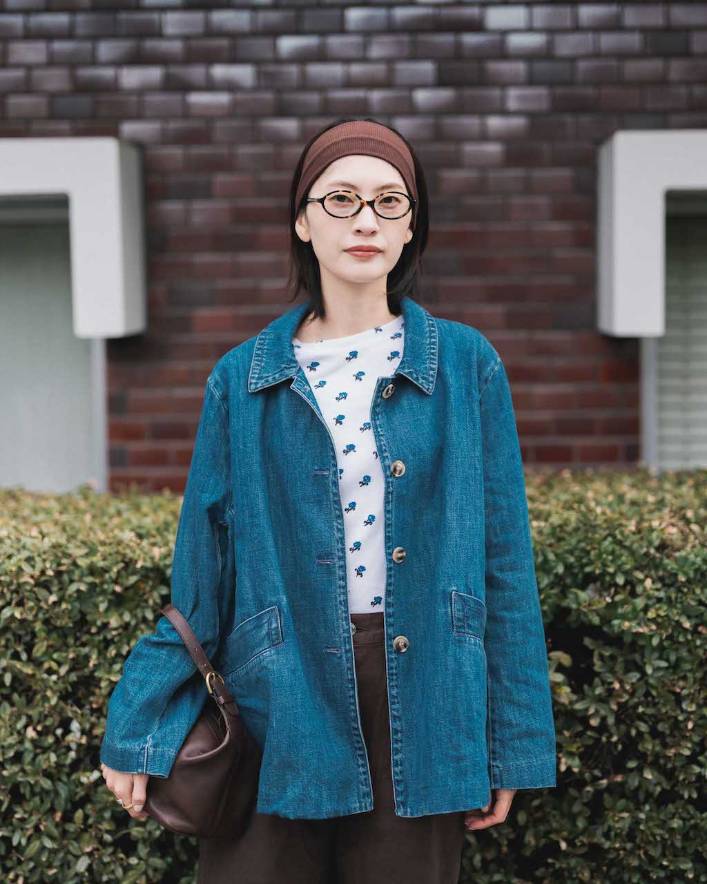 デニムジャケットとブラウンボトムのダークな色合いにホワイトベースの小花柄が爽やかに映える。ヘアバンドやバッグをボトムの色とリンクさせたのも上級者な着こなしポイント。