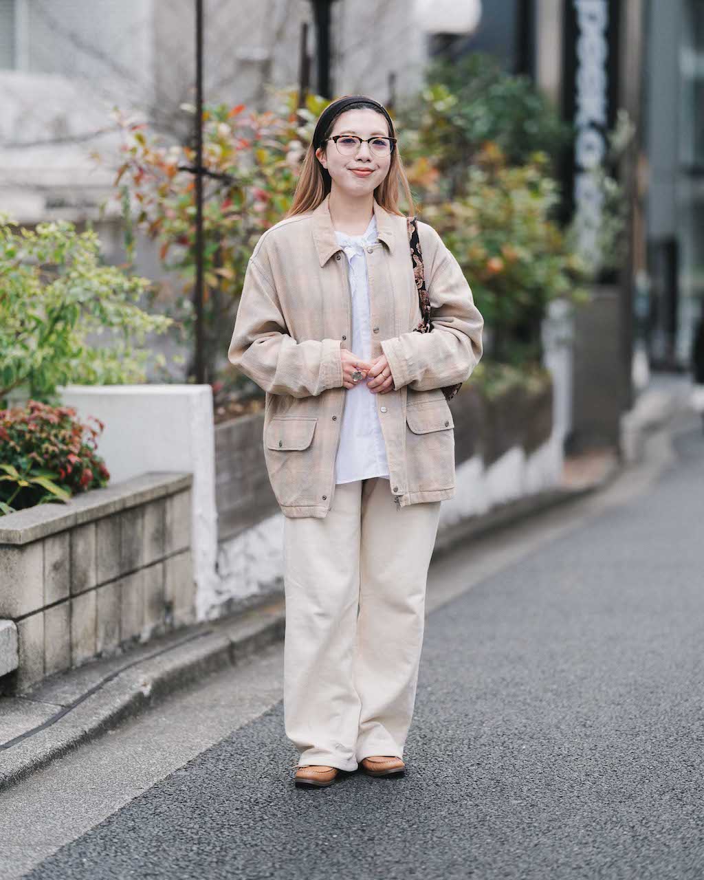 春らしいベージュジャケットをメインにアイボリーを合わせたグラデーションコーデ。動物モチーフがキュートな総柄バッグをアクセントにして、装いに愛らしい抑揚をつけて。