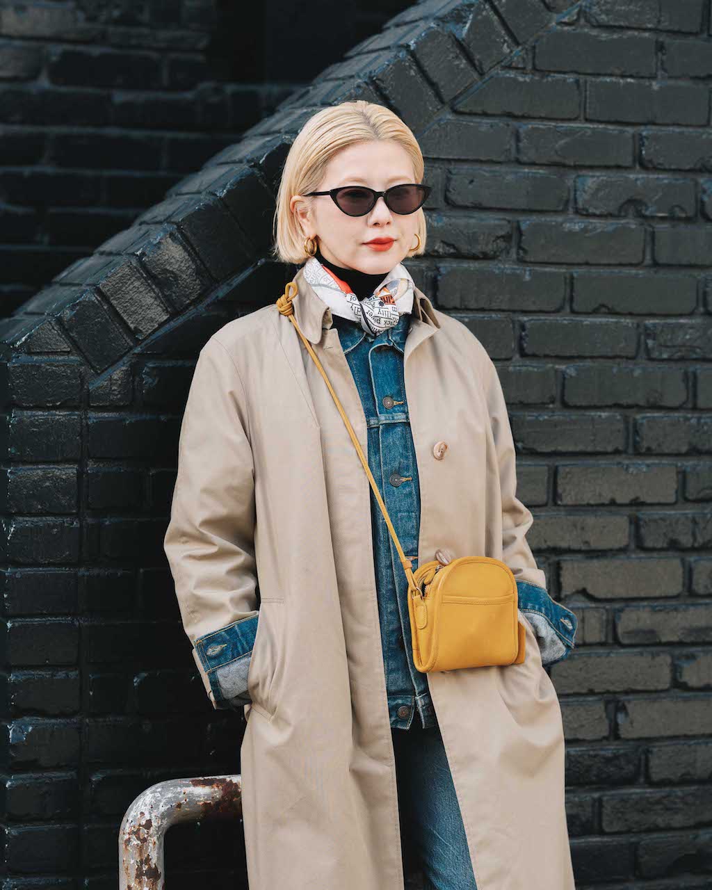デニムジャケットとトレンチコートの重ね着は、寒さが残る春のはじめにおすすめの着こなし。デニムオンデニムでクールにまとめつつ、スカーフ使いでおしゃれにシフトしよう。