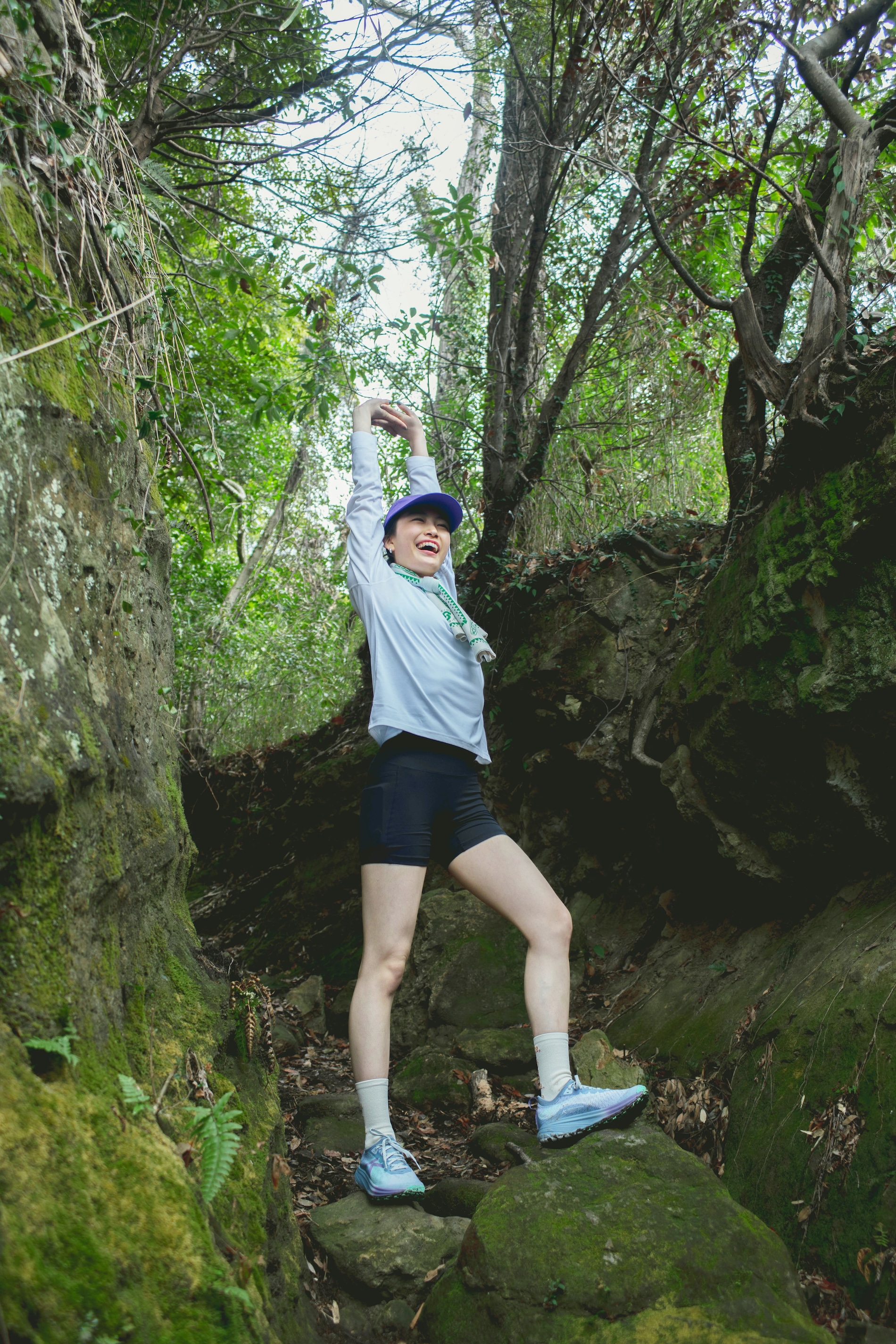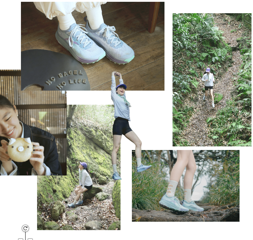 トレイルランは、ずっと走り続けなくても大丈夫。坂道では歩いたり、景色のいい場所では立ち止まったり。その日の気分で、自分のペースで楽しめるのがちょうどいい。新しいトレイルランニングシューズにご機嫌な栁沼さんは、足元をパシャパシャ撮影する場面。「こんな感じなら、また来たい!」と、うれしそう。