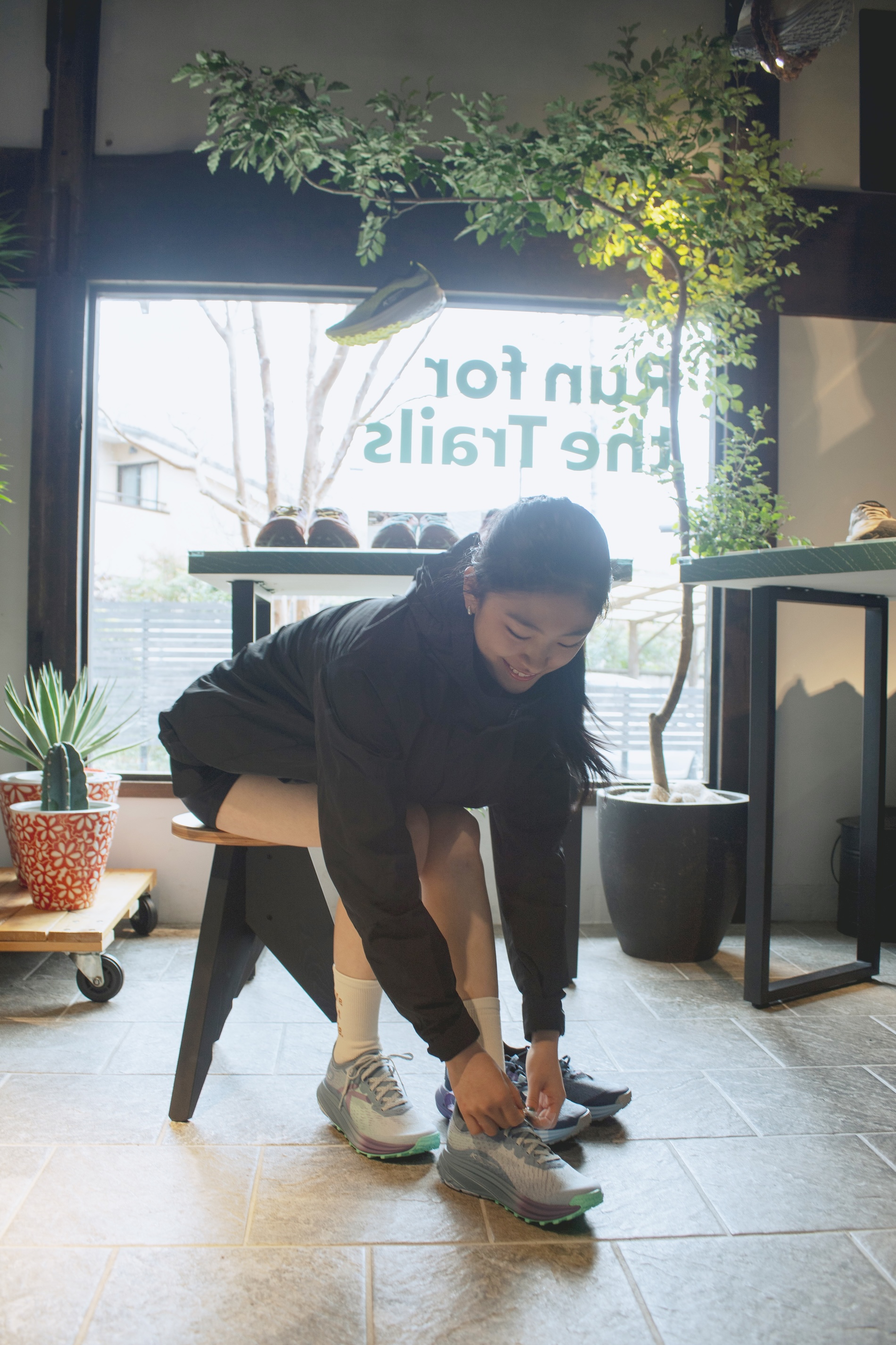 会場には、注目のトレイルランニングシューズ「SEEK」と「ROAM」がずらり。栁沼さんもプロにレクチャーを受けながら、自分に合うとっておきの一足を選びます。山のための一足だけれど、街にもなじむスタイリッシュなデザインもいいところ。「これなら普段のコーディネートにも合わせて履けそう!」と栁沼さん。