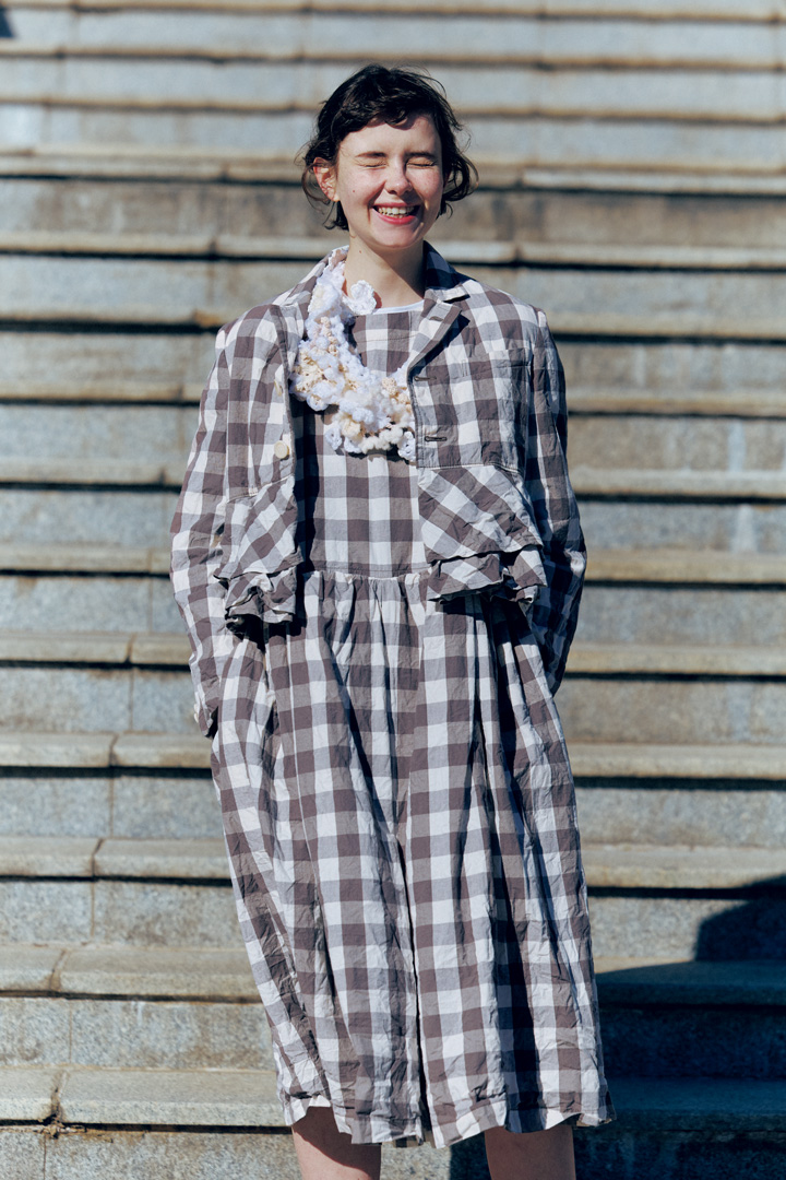 コート¥176000 / ANATOMICA(アナトミカ 東京)、ワンピース¥55000 / TSURU By MARIKO OIKAWA(ツル バイ マリコ オイカワ)、ジャケット¥59400、T シャツ¥13200/ともにagnès b.( アニエスベー)、シューズ¥20900 /J&M DAVIDSON Shoes(モーダ・クレア)、その他/スタイリスト私物