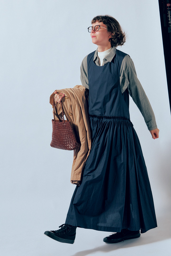 ワンピース¥74800 / Scye(マスターピースショールーム)、中に着たシャツワンピース¥21780/MidiUm(i マザーズインダストリー)、T シャツ¥2970 / Hanes(ヘインズジャパン カスタマーセンター)、手に持ったコート¥52800 / Véritécoeur(ヴェリテクール)、メガネ¥49500 / EYEVAN(アイヴァン 東京ギャラリー)、バッグ¥27500 / maison de soil(メゾン ド ソイル恵比寿店 )、スニーカー¥6490 / CONVERSE(コンバースインフォメーションセンター)