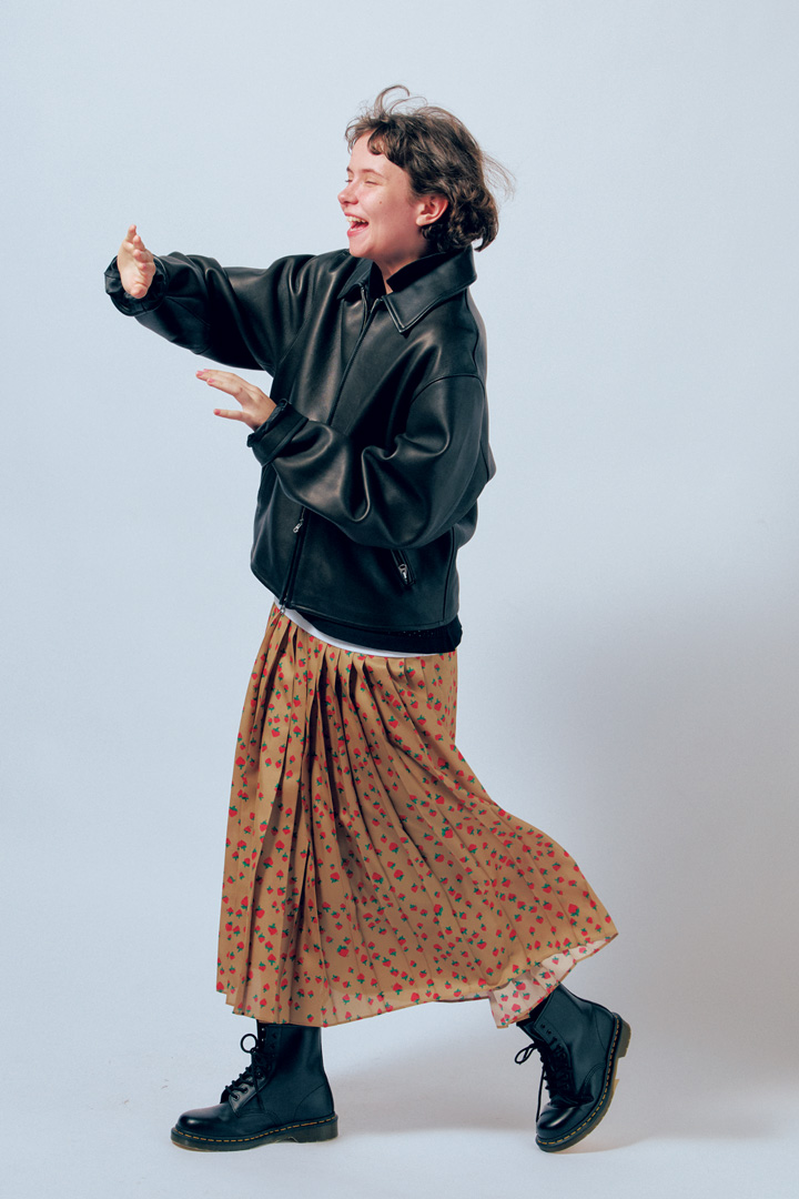 ジャケット¥121000 / LOEFF(エイチ ビューティー&ユース)、セーター¥48400 /JOHN SMEDLEY(リーミルズ& カンパニー)、T シャツ¥12650 / ARMEN(ビューカリック& フロリック)、スカート¥46200 / MUVEIL(ミュベール)、ブーツ¥31900 / Dr. Martens(ドクターマーチン・エアウエア ジャパン)、タイツ/スタイリスト私物