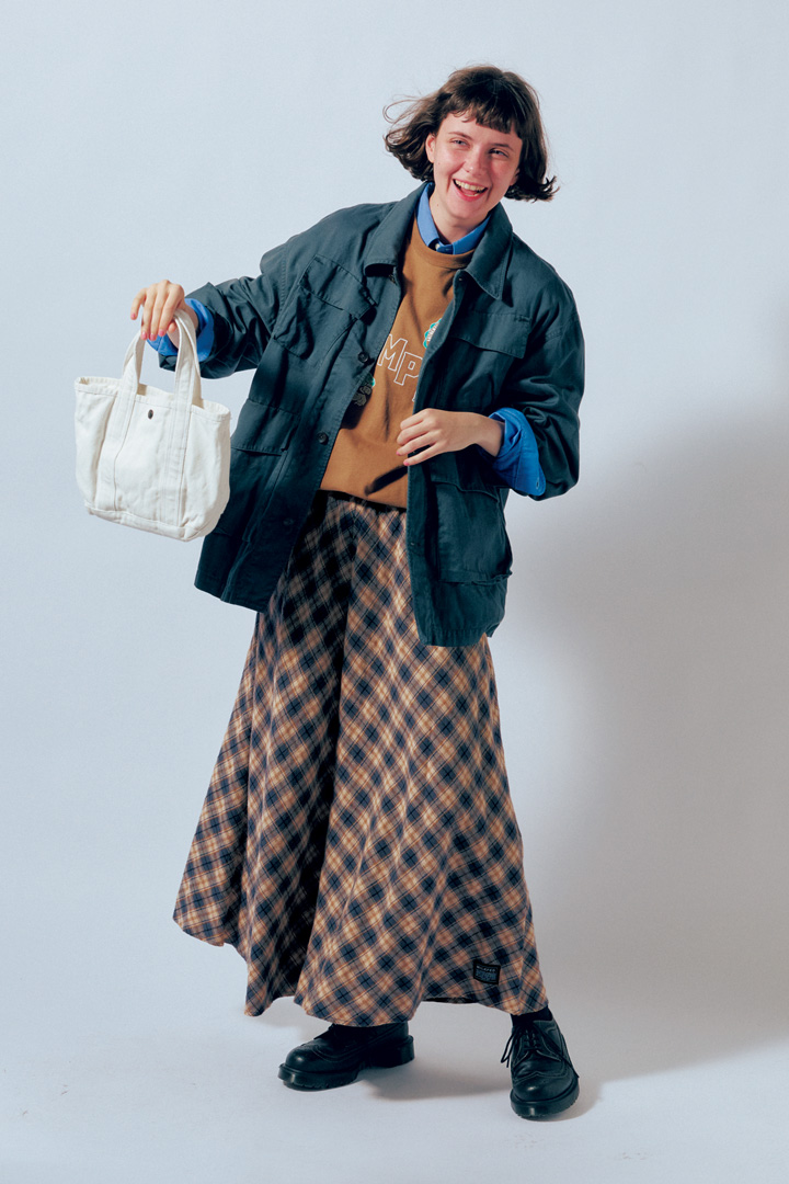 ジャケット¥60500 / UNDECORATED(アンデコレイテッド)、T シャツ¥6050 / Champion(ヘインズブランズ ジャパン カスタマーセンター)、シャツ¥42900/ INDIVIDUALIZED SHIRTS(メイデン・カンパニー)、スカート¥13200/MILKFED.( ミルクフェド 新宿)、バッグ¥12100 / ARMEN(ビューカリック& フロリック)、シューズ¥49500 / Dr. Martens(ドクターマーチン・エアウエア ジャパン)、タイツ/スタイリスト私物