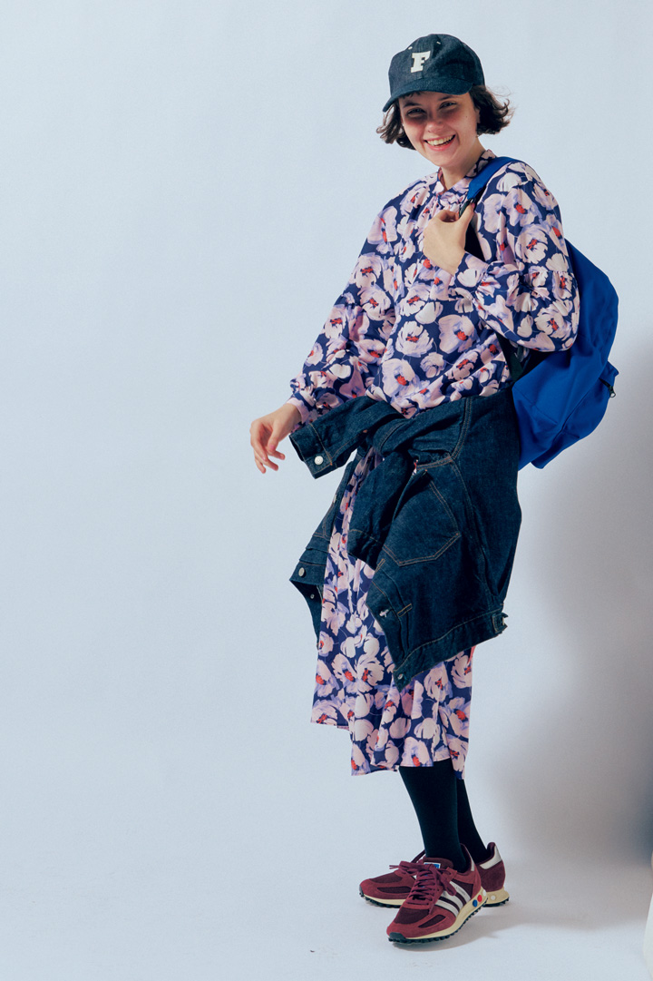 鮮やかな花柄、襟や袖口のギャザーデザイン、ほんのり透け感のあるジョーゼット素材が相まって、とてもエレガントなワンピース。カジュアルダウンを狙って、キャップやデニムジャケット、スニーカーなど、ボーイなアイテムを詰め込む。それでもまだまだクラシカル& 存在感たっぷりでかわいい。