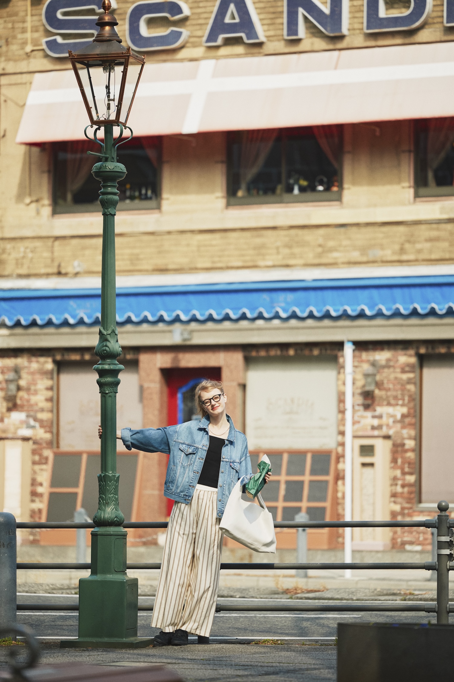 ニットトップス¥10450、パンツ¥16500/ともにROUGE VIF、デニムジャケット¥15400/Levi’s、バッグ¥19800/CHIMERE、スニーカー¥15400/adidas(以上すべてルトリオ アバハウス アトレ恵比寿店)
