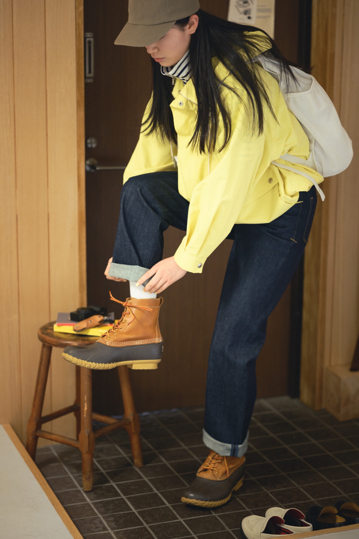 デニムパンツ¥27500 / YANUK(カイタックインターナショナル)、ジャケット¥42900 / Traditional Weatherwear(トラディショナル ウェザーウェア 渋谷店)、ハーフジップトップス¥25300 / SCYE BASICS(マスターピースショールーム)、キャップ¥20900 / KIJIMA TAKAYUKI × YLÈVE (イレーヴ)、バックパック¥5390 / MILLET(ミレー・マウンテン・グループ・ジャパン・カスタマーサービス)、ブーツ¥¥41800 / L.L.Bean(エル・エル・ビーンカスタマーサービスセンター)