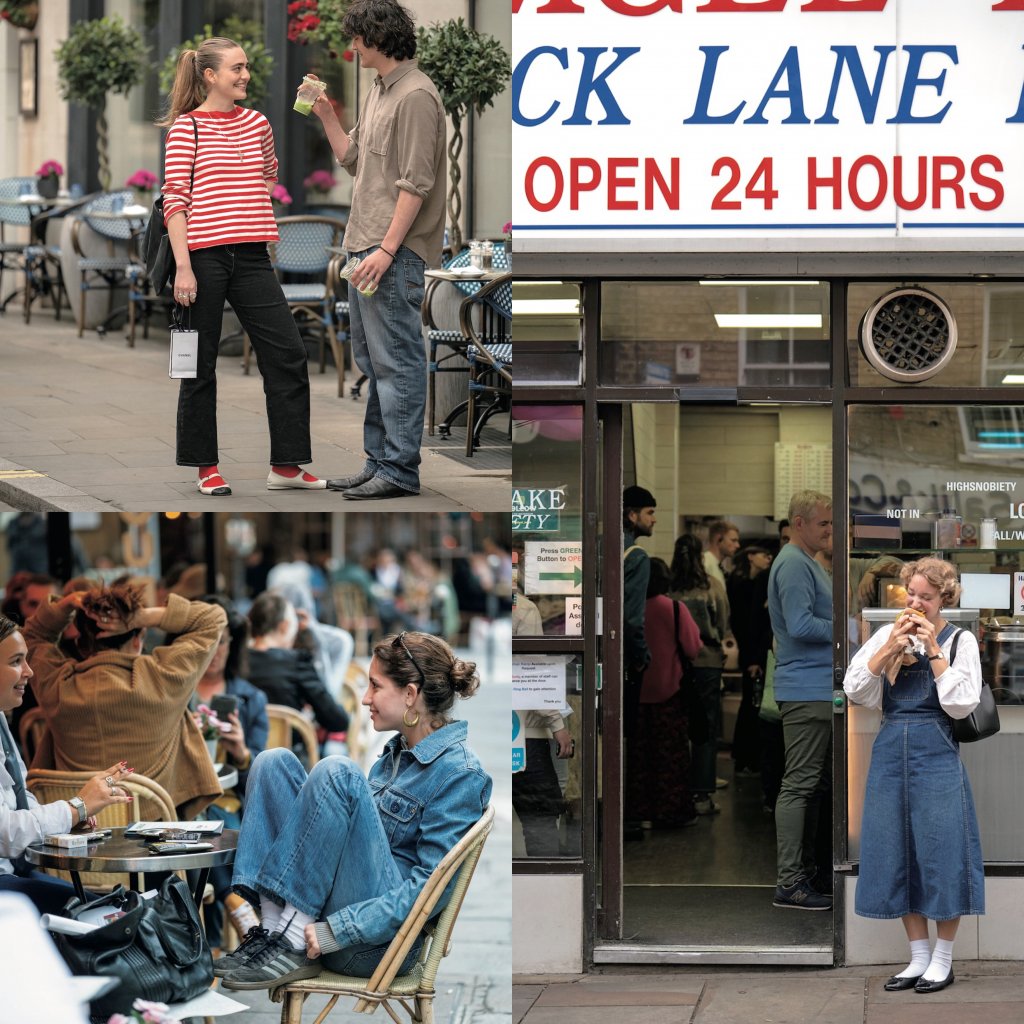 ブリック・レーンの名物、塩味が効いた「ソルトビーフベーグル」にかぶり付くVictoria。デニムのジャンパースカートを、甘いブラウスやクルー丈ソックスの合わせでガーリーに着こなす。