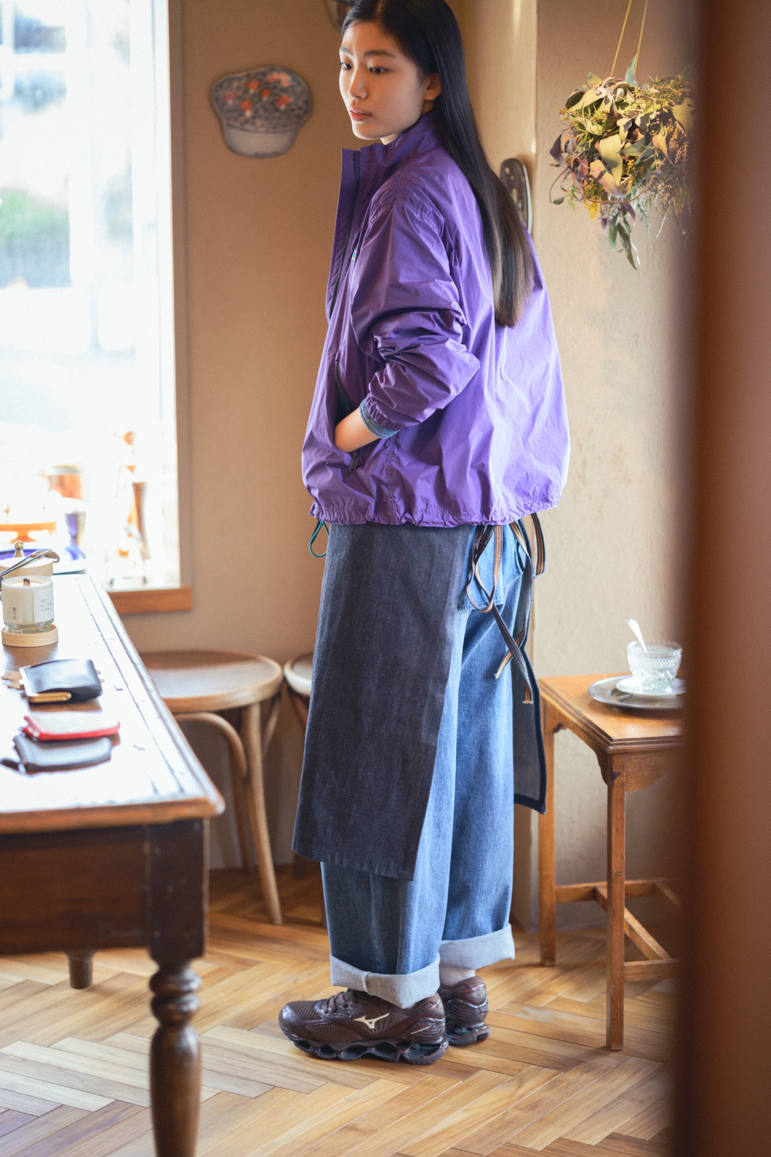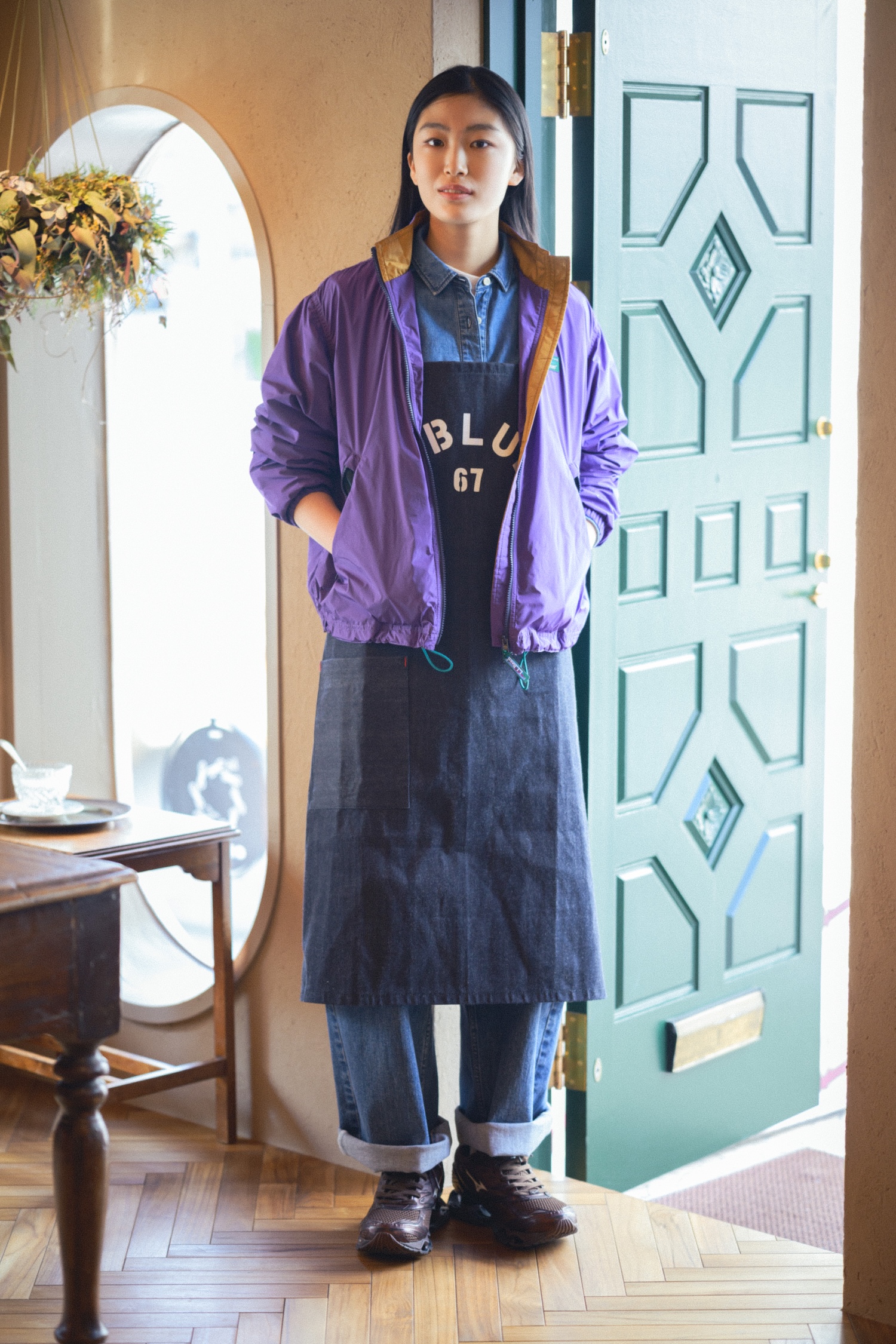 デニムパンツ¥25300 / RED CARD、デニムシャツ¥17600 / Rouge vif(ともにアバハウスインターナショナル オンラインストア)、ジャケット¥24200 / L.L.Bean(エル・エル・ビーン カスタマーサービスセンター)、エプロン¥13200 / BLUE BLUE(ハリウッドランチマーケット)、シューズ¥29700 / Mizuno(ミズノ お客様相談センター)
