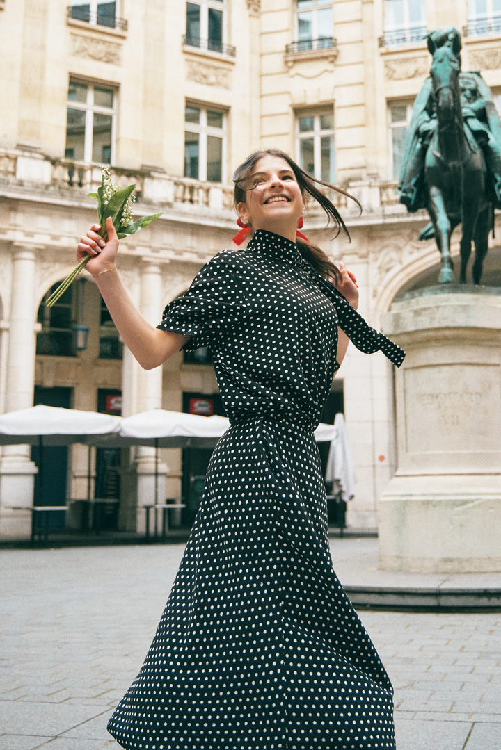 1970年代のフランス映画を彩った、クレープ素材のブラウスやスカートやワンピース。生地が持つなめらかな落ち感と、歩くたびに美しくゆらめく様子は、大人の女性らしいエレガンスを放つ。アイロンいらずという合理性も見逃せないポイント。おすすめは、少女の無垢さと大人の色香が同居するポルカドット。やわらかな生地の上で揺れるドットは、視覚的なリズムを生み、まるでメロディのように軽やかに踊りだす。