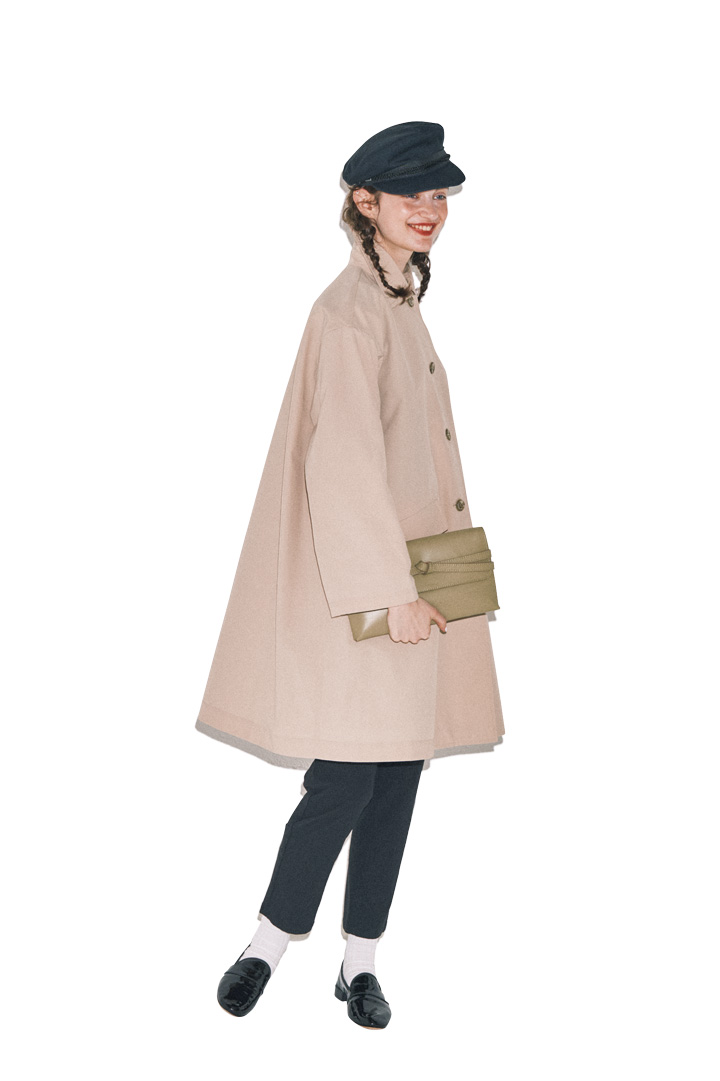 コート¥47300/Traditional Weatherwear(トラディショナル ウェザーウェア 渋谷店)、パンツ¥7590/Golden Bear (コスギ お客様相談室)、キャスケット[参考商品]/agnès b.(アニエスベー)、バッグ¥57200/GIANNICHIARINI (ジャンニ キアリーニ 銀座店)、シューズ¥70400/Repetto(ルック ブティック事業部)、ソックス/スタイリスト私物