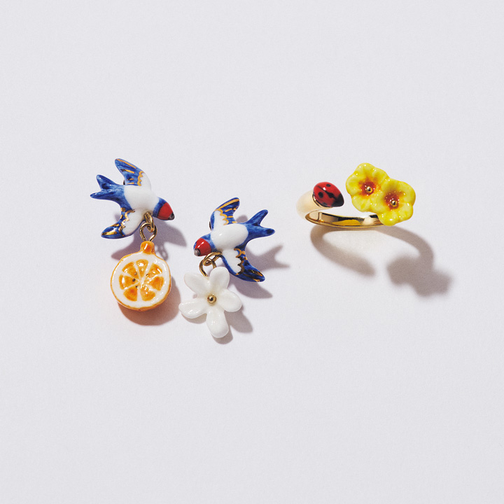 ポーセリン製のミニチュアアニマルをアクセサリーに落とし込む《ナッシュ》。今季は動物だけでなく花や果実などの春らしいモチーフが勢ぞろい。たとえばピアスにはツバメやオレンジの花、リングにはてんとう虫とアラマンダの花があしらわれ、顔まわりや手元をキュートに彩ってくれる。