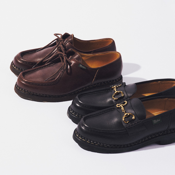 フレンチスタイルの足元に欠かせないのが、1908年創業の名門《パラブーツ》。代名詞といえるチロリアンシューズ「ミカエル」と、上品なビットローファー「オルセーティ」があれば、ジェントやレディなど、どんなスタイルもシックにキマる。
