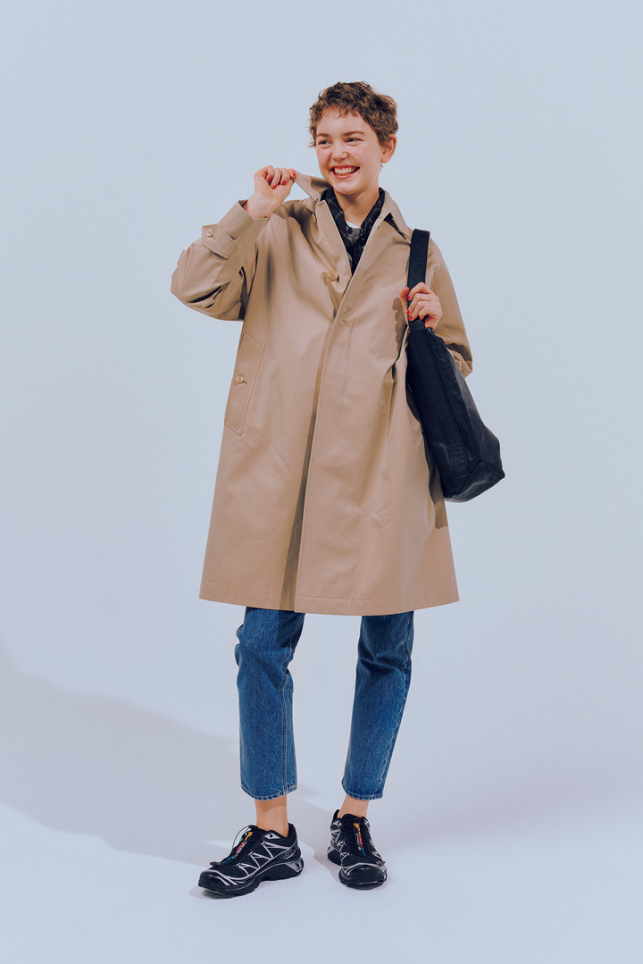 コート¥154000、Tシャツ¥15400、デニムパンツ¥39600、スカーフ¥16500/以上すべてANATOMICA、バッグ¥69300/ANATOMICA by TEMBEA(以上すべてアナトミカ東京)、スニーカー¥28600/Salomon(サロモン コールセンター)