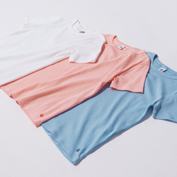 120年以上にわたり、ベビーから大人までの肌着や日常着をつくり続けてきた確かな実績で、フランスの人々から厚い信頼を得る《プチバトー》。Tシャツは、肌にやさしいオーガニックコットンや、伸縮性に富んだリブ編みによる滑らかな肌触りによってとにかく着心地がいい。