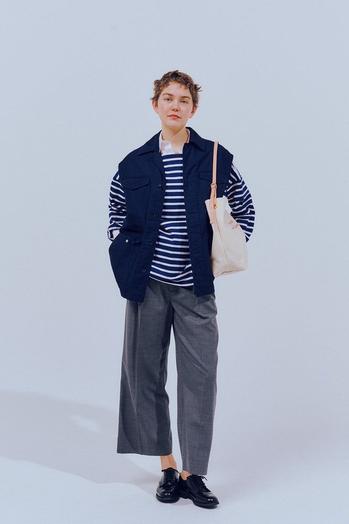 ベスト¥35200、カットソー¥19800、バッグ¥16500/以上すべてLe Minor(ゲストリスト)、シャツ¥17930/23区(オンワード樫山 お客様相談室)、パンツ¥31900/Traditional Weatherwear(トラディショナル ウェザーウェア 渋谷店)、シューズ¥68200/SANDERS(サンダース ジャパン)