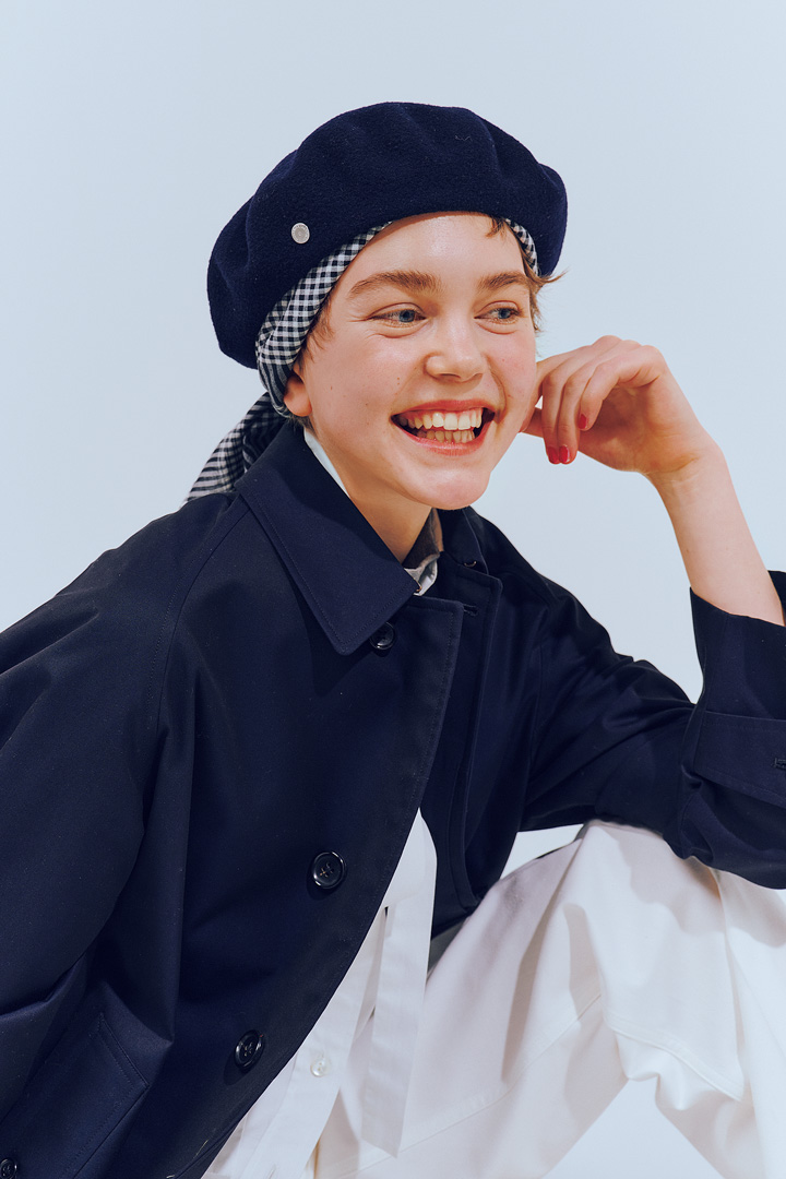 ベレー帽¥17600/LAULHÈRE(真下商事)、コート¥154000、シャツ¥25300、カットソー¥11000、パンツ¥41800、スカーフ¥13200/以上すべてANATOMICA(アナトミカ 東京)