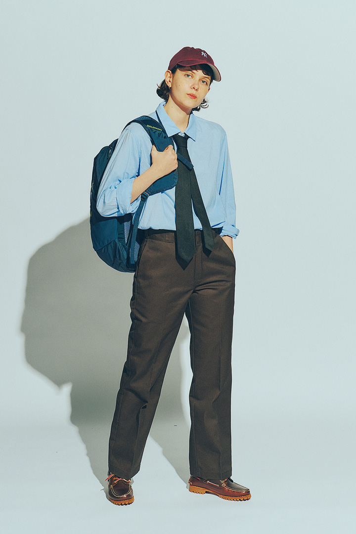色やディテールにテックなムードが宿る、《サロモン》の「XT 25」が主役。シャツ、タイ、スラックスと合わせてIVY に仕上げて。シャツ¥26400 / YAECA(ヤエカ アパートメント ストア)、パンツ¥7700/Dickies(エドウイン)、キャップ¥4400/’47(フォーティーセブン)、ネクタイ¥14300/A.P.C(. アー・ペー・セー カスタマーサービス)、バックパック¥17600 / Salomon(サロモン コールセンター)、シューズ¥25300/Timberland( VFジャパン)