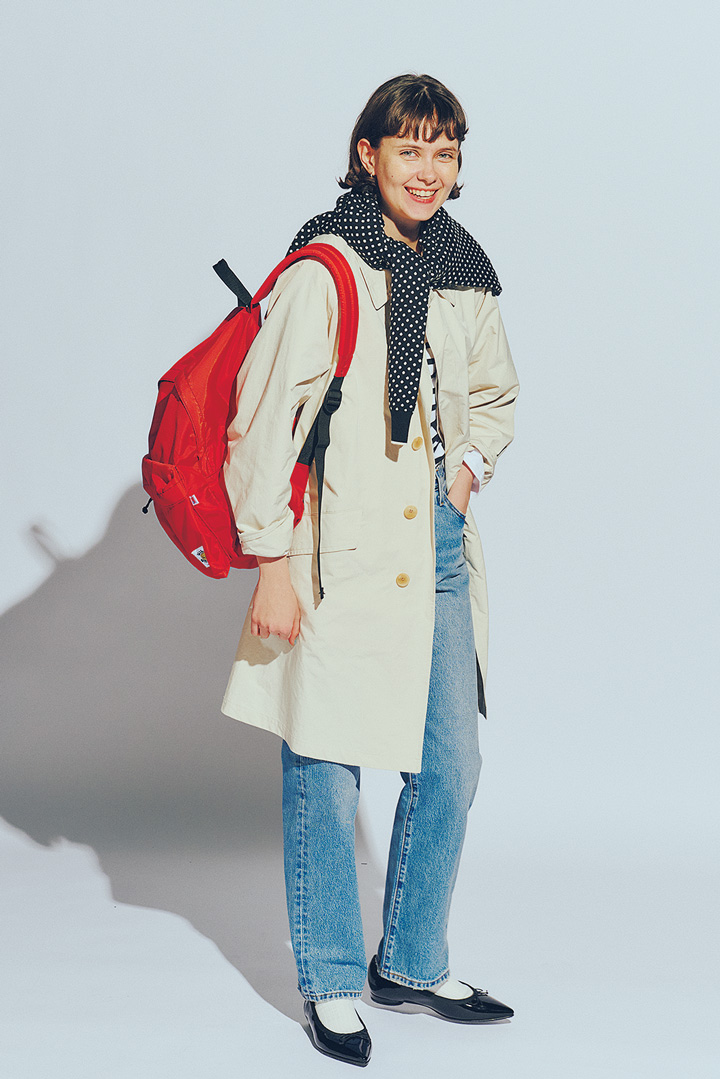 ミニマルなデイパックなら、差し色としてもアリ。コートにボーダーTee、デニムパンツのカジュアルルックに、鮮やかな赤を効かせてパリジェンヌ気分で。コート¥121000 / SCYE BASICS(マスターピースショールーム)、カットソー¥20350 / SAINT JAMES(セント ジェームス代官山店)、デニムパンツ¥16500/Levi’s ®︎(リーバイ・ストラウス ジャパン)、肩にかけたセーター¥39600 / CABaN(キャバン 丸の内店)、バックパック¥12980 / WILD WALLETS(城屋)、シューズ¥18920 / tsumori chisato WALK(モーダ・クレア)、ソックス/スタイリスト私物