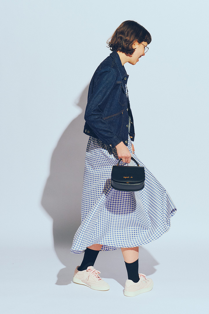 愛らしいギンガムチェックのワンピースでガールズマインドを満喫。スポーティかつクラシカルな「クラブシー」で、程よいきちんと感をプラスして。デニムジャケット¥44000 / YAECA(ヤエカ アパートメント ストア)、ワンピース¥7990 / ZARA(ザラ カスタマーサービス)、メガネ¥44000 / OLIVER GOLDSMITH(コンティニュエ)、バッグ¥77000 /agnès b.( アニエスベー)、スニーカー¥16500/Reebok(リーボック)、ソックス/スタイリスト私物
