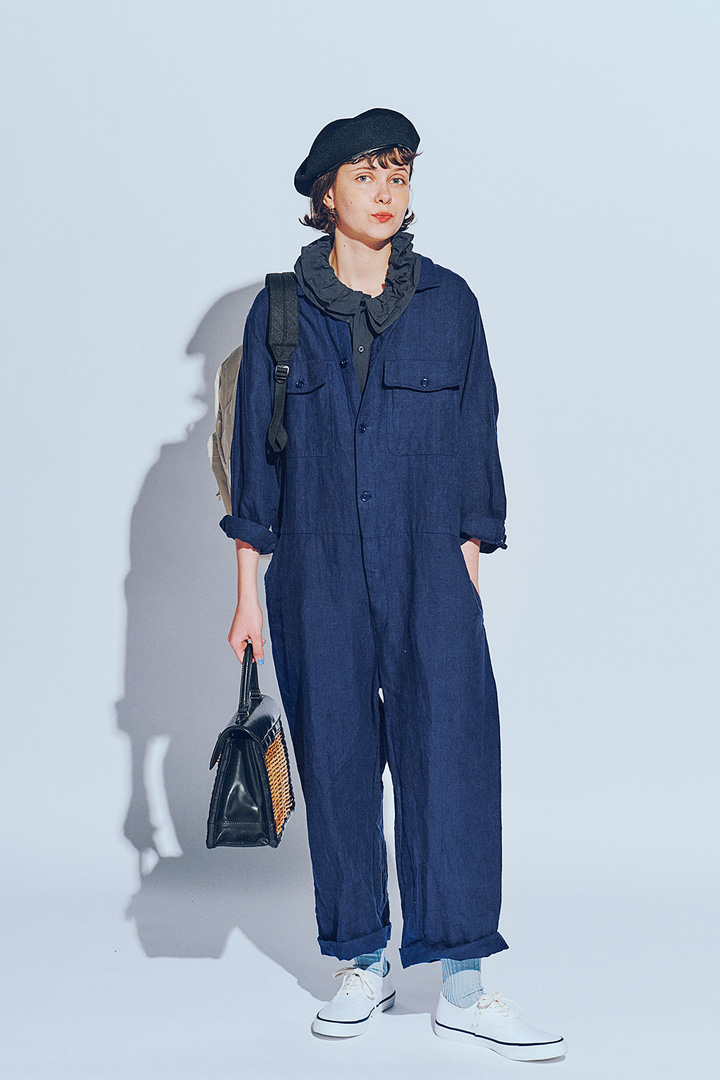 ワーク感の残るガールスタイルを、軽やかに導く白いデイパックとキャンバススニーカー。ジャンプスーツ¥75900 / YAECA CANVAS DESIGN(ヤエカ)、ブラウス¥39600 / TOUJOURS (トゥジュー 代官山ストア)、ベレー帽¥¥6930 / KANGOL(カンゴールヘッドウェア)、バックパック¥7480/JanSpor(t ユニグローブ)、ハンドバッグ¥154000/eb・a・gos(エバゴス)、ソックス¥990 /靴下屋(タビオ)、スニーカー¥11000 / SPERRY(スペリー)