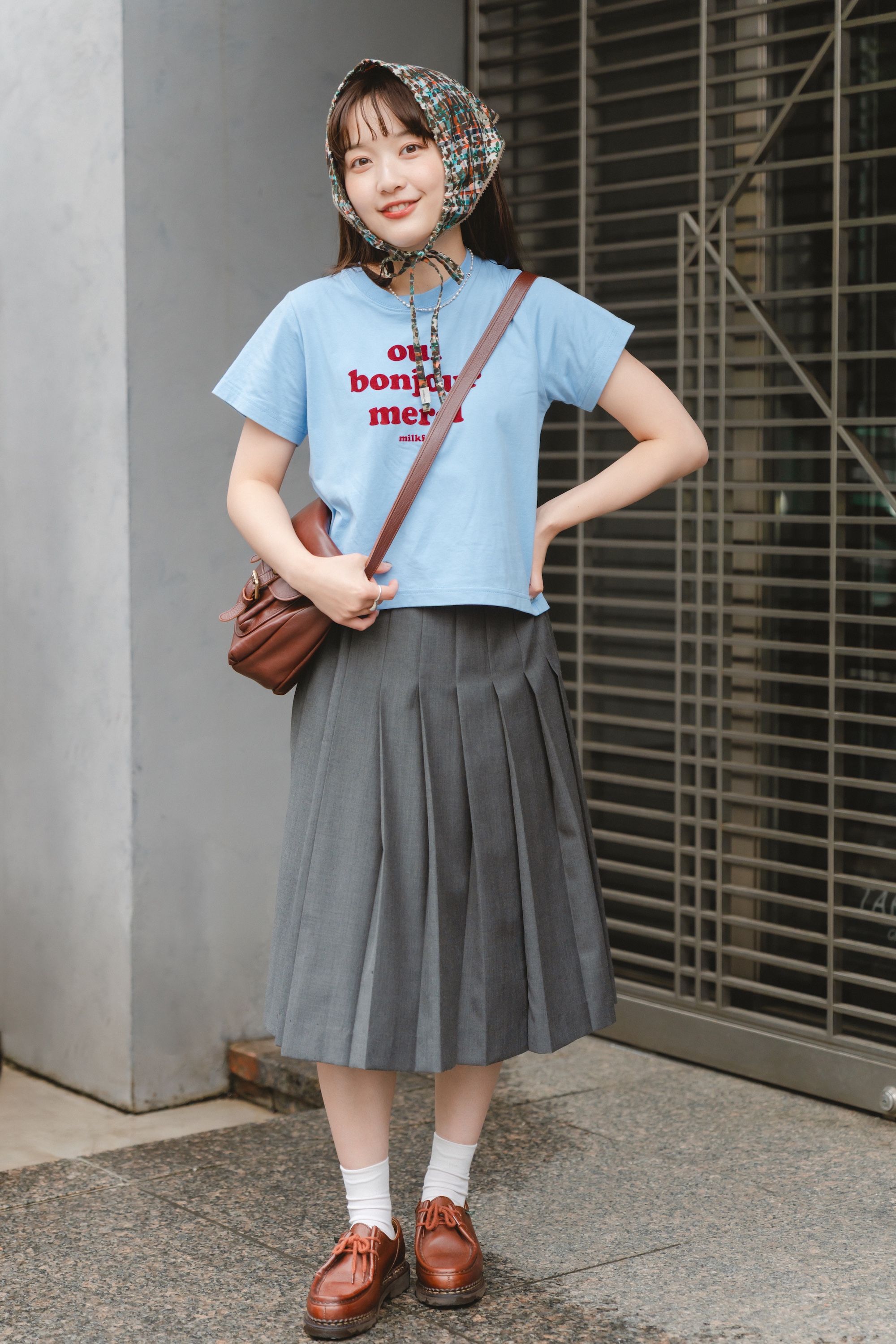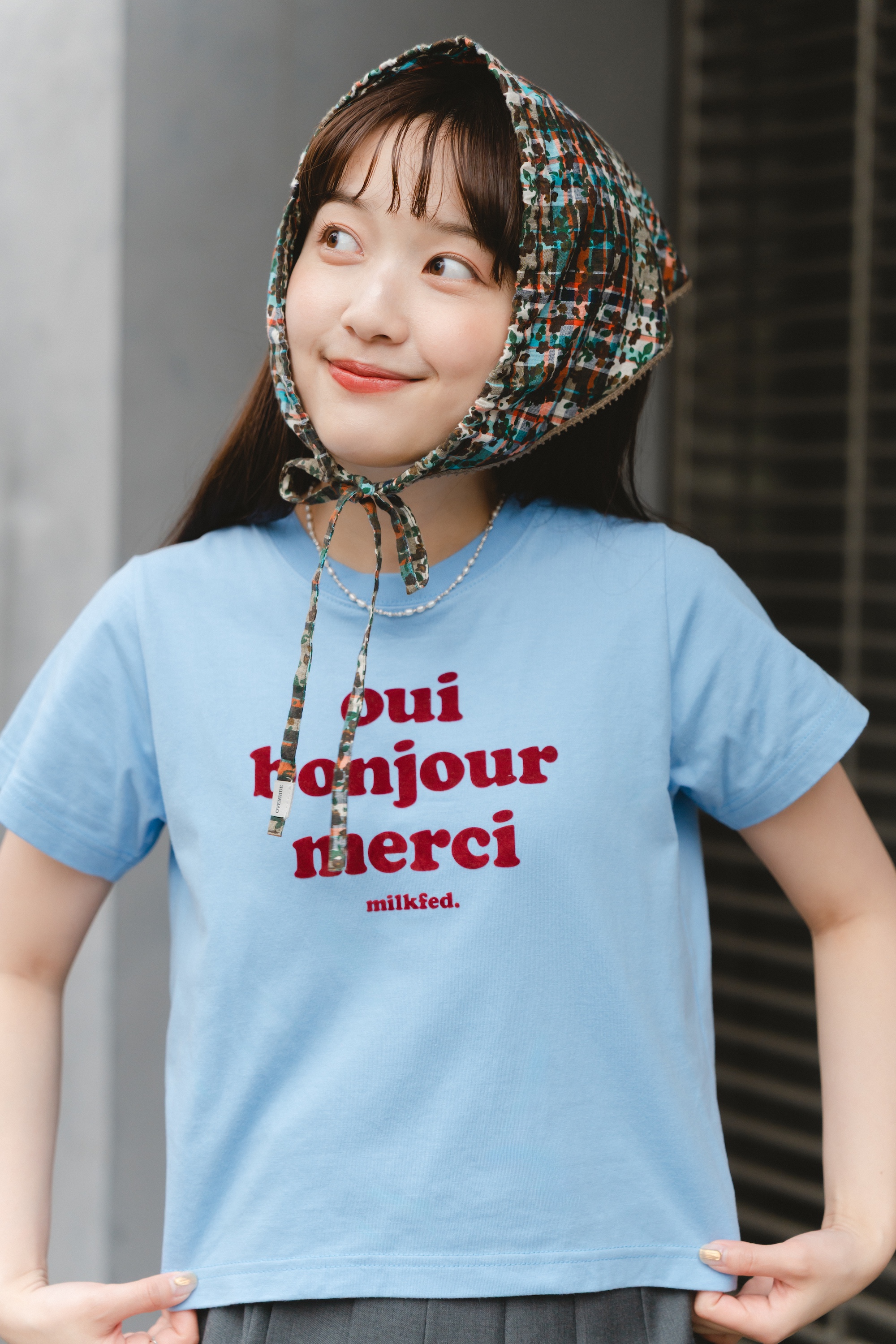 フロッキープリントのグラフィックや水色×ダークレッドの配色も相まって、温かみのあるレトロなムードのTシャツ。コンパクトなシルエットでフィット感があり、低身長の大島さんにもちょうど良いサイズ。プリーツスカートで上品にまとめて、バブーシュカで遊びを加えたコーディネート。2サイズ展開なので、あなただけの好みのフィット感を探してみて。