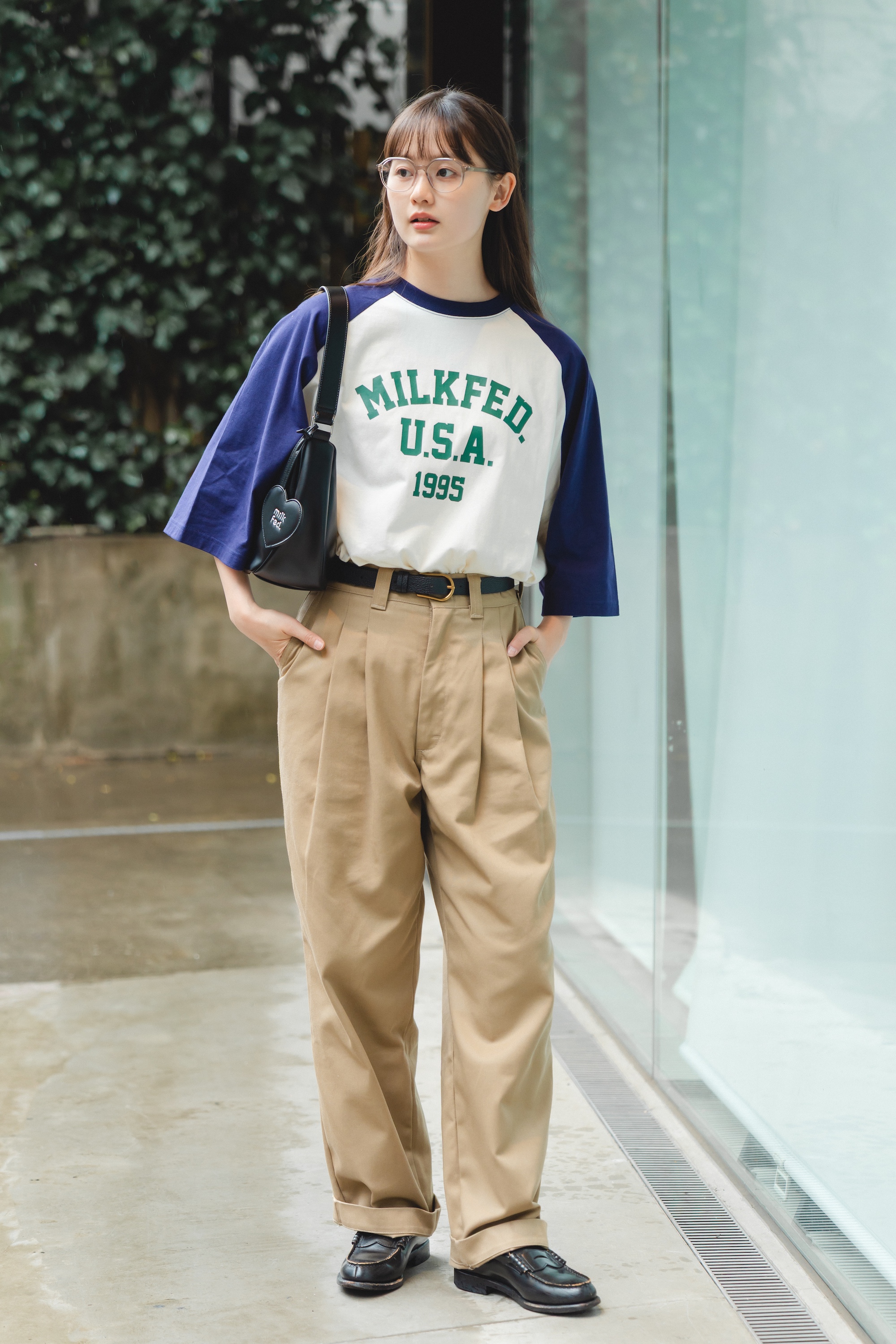 ゆとりのあるオーバーサイズのシルエットに、カレッジロゴムードのプリントをあしらったTシャツ。うさみちゃんは、チノパンツとローファーを合わせて、Tシャツの裾をINしてトラッドな着こなしに。ハート柄のミラーがポイントのハンドバッグで、ちょっとレディなエッセンスをプラスしたのがポイント。Tシャツの裾はアウトしてチュニックぽく着るのもあり。