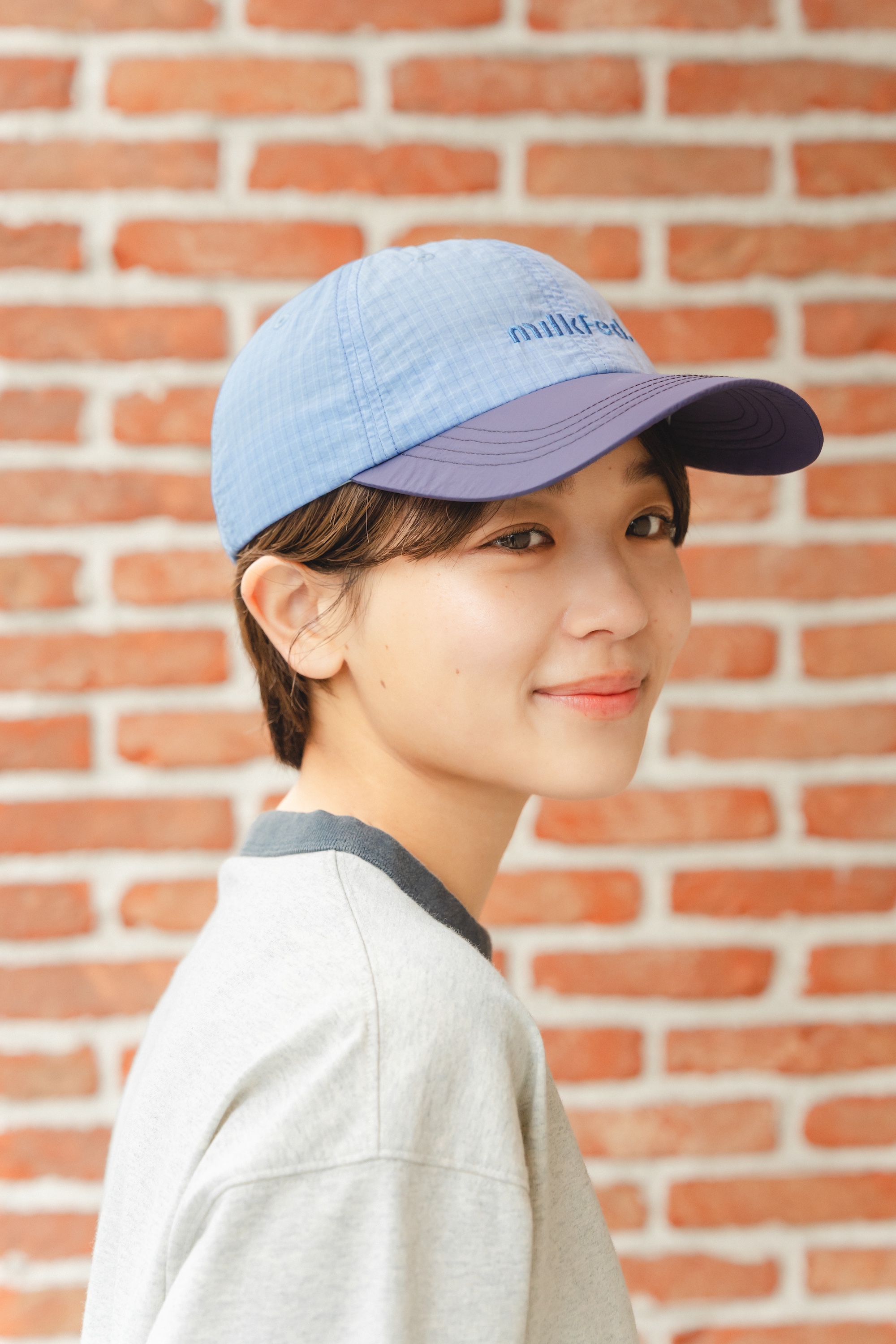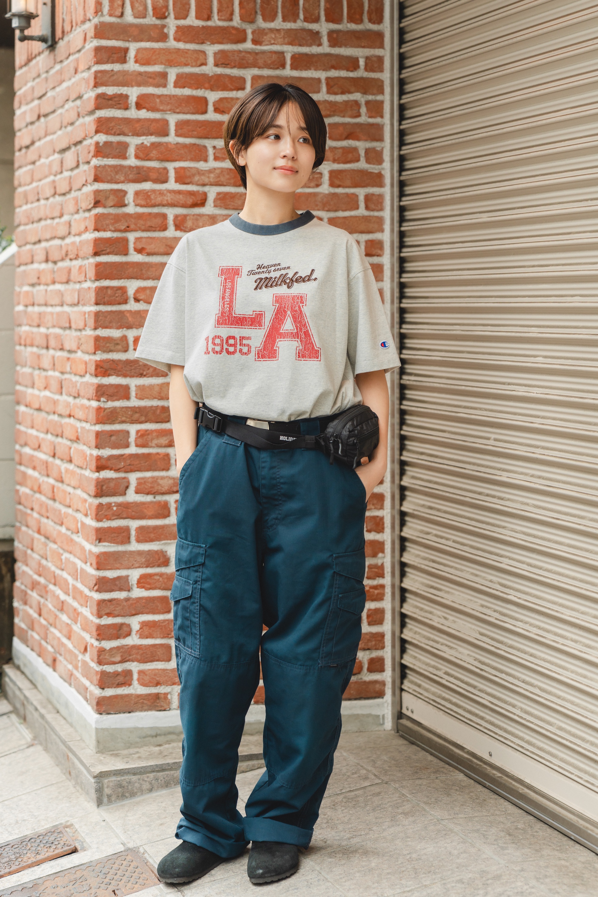 ボーイなスタイルに定評がある、真雪ちゃんが選んだのはヴィンテージライクな《チャンピオン》とコラボしたTシャツ。ウォッシュ加工を施しているので、着こんだようなこなれ感がグッド。インパクトあるロゴを主役に、ネイビーのカーゴパンツで落ち着いた配色でコーディネート。キャップもトーンを合わせたブルーをチョイスすることで大人にまとめて。