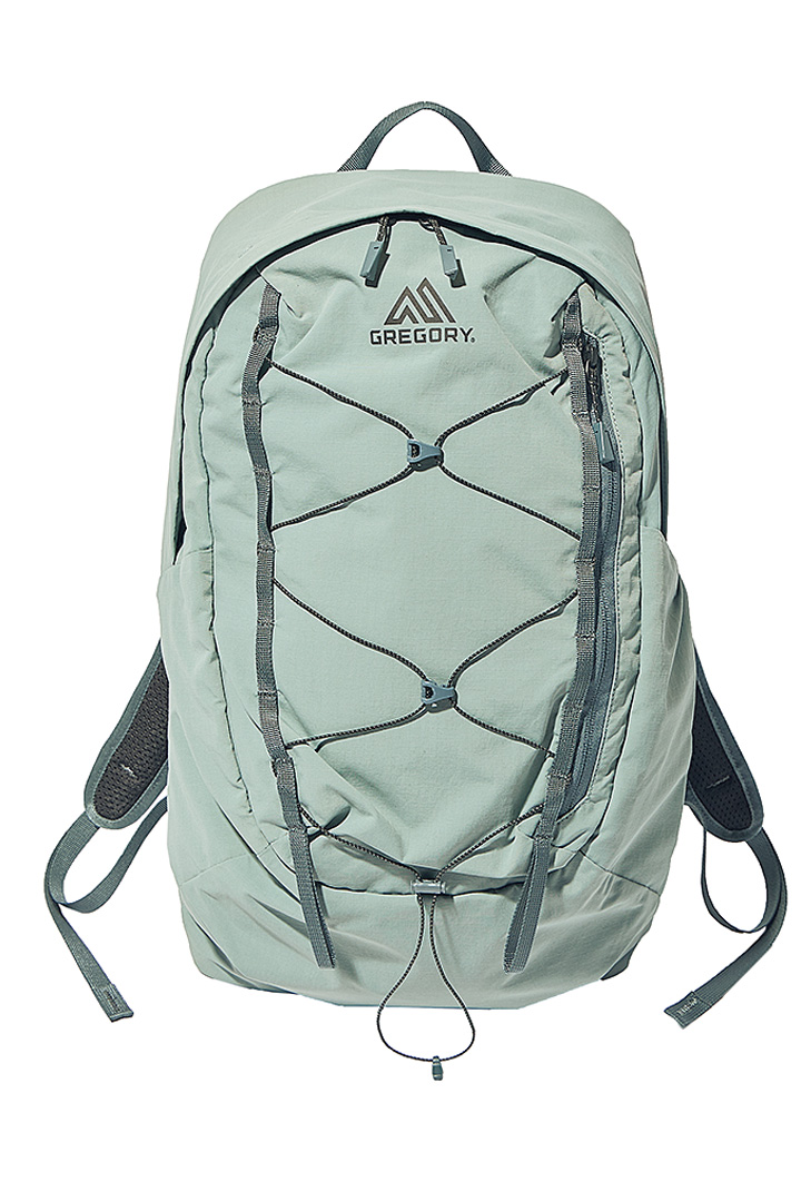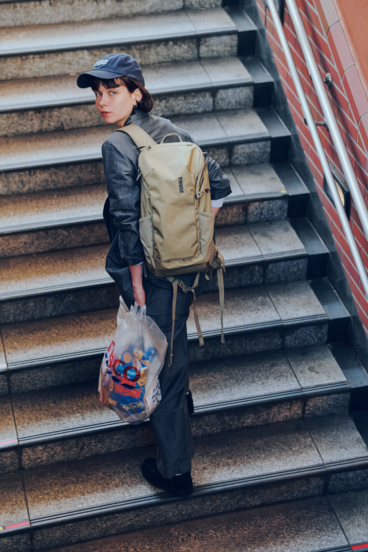 着こなしの面積を大きく占めるバックパックは、ベーシックカラーを選ぶのがベター。いつもの黒や白、ネイビーといった装いにも馴染みやすく、アウトドアムードも程よく抑えられる。グレーのセットアップに、スウェーデン発のアウトドアブランド《スーリー》のバックパックを合わせてモダンに仕上げて。