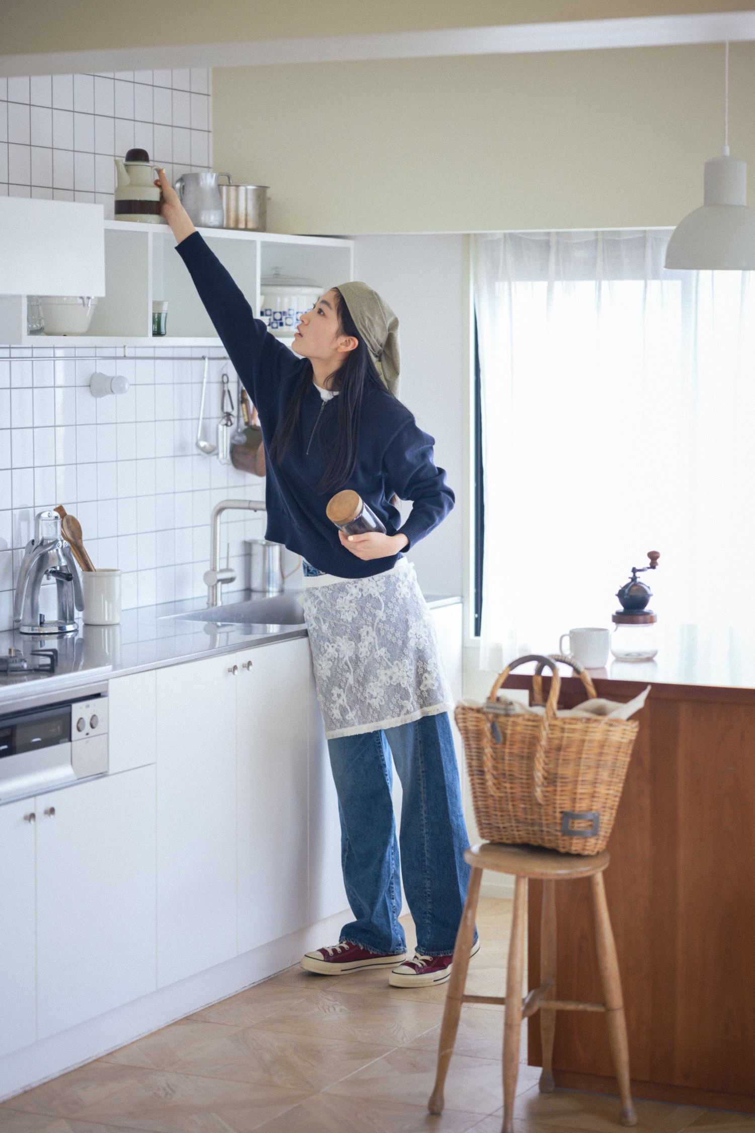 日本が誇るデニムの産地、岡山・児島で生まれた《ジャパンブルージーンズ》。股上が深く、ゆとりのあるストレートシルエットに、自然なムラ感のある生地が相まって、どこかヴィンテージライクな佇まいに。少しガールに寄せたい日は、レースのラップスカートを重ねて。ラフなデニムにやわらかなニュアンスが加わって、ぐっとロマンティックな表情へ。