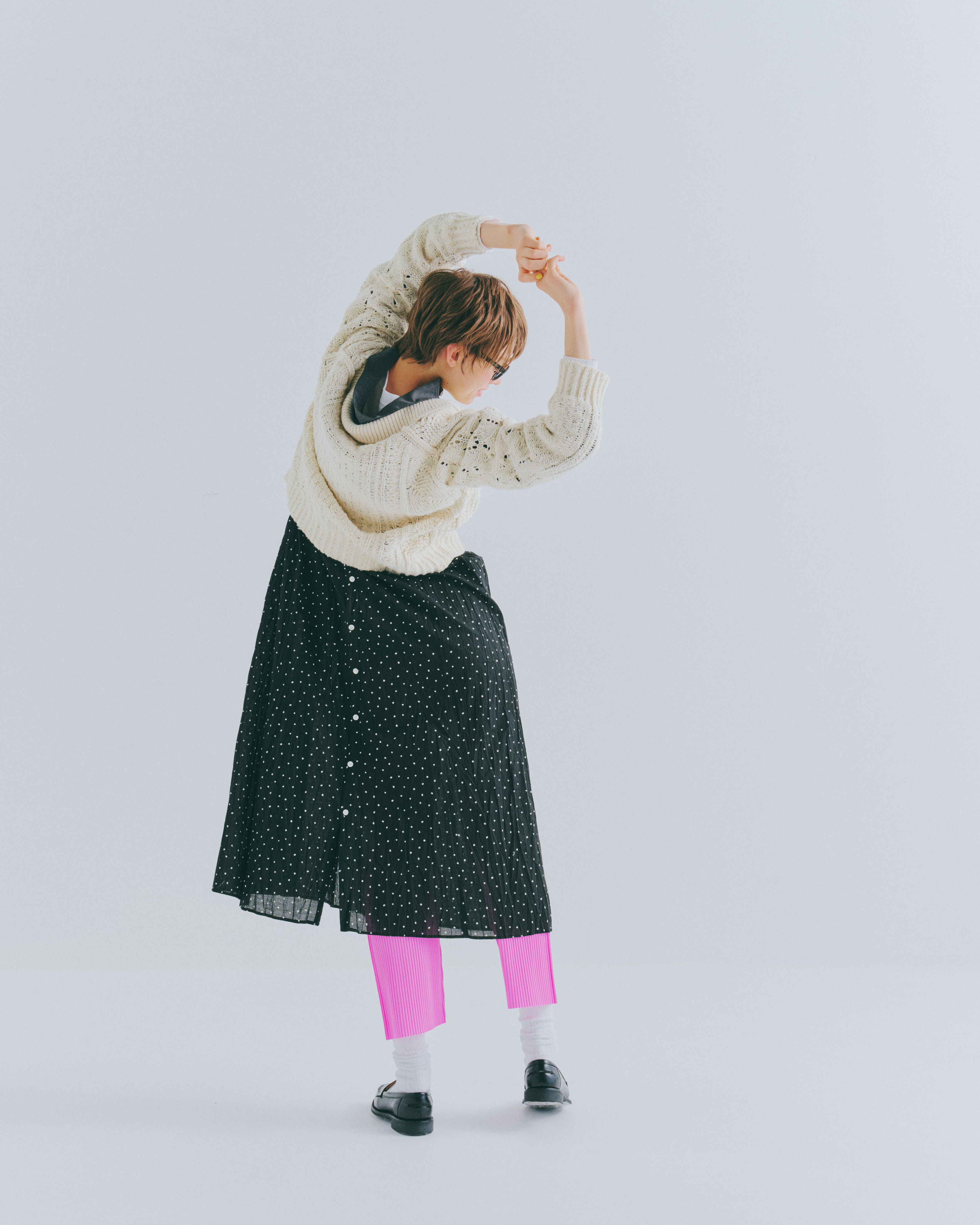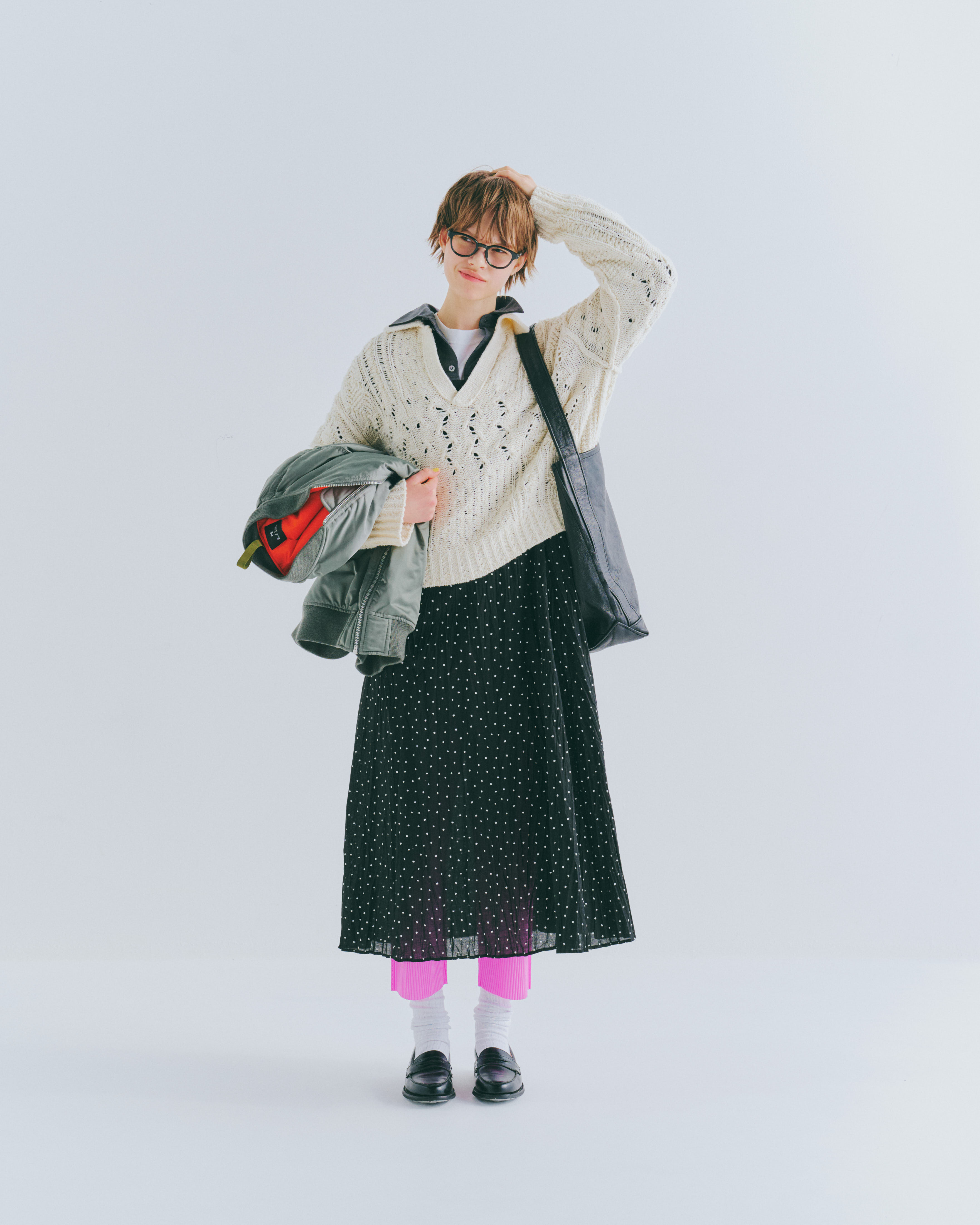 ドット柄のキャミソールワンピースは、落ち着いたムードの中に、可憐さが漂う一枚。裾からピンクのプリーツパンツをちらりと覗かせれば、春らしい軽やかなリズムを添えてくれる。ざっくりニットとローファーで整えて、ドット柄とピンクでも甘くなりすぎないバランスに仕上げると”ちょうどいい”んです。