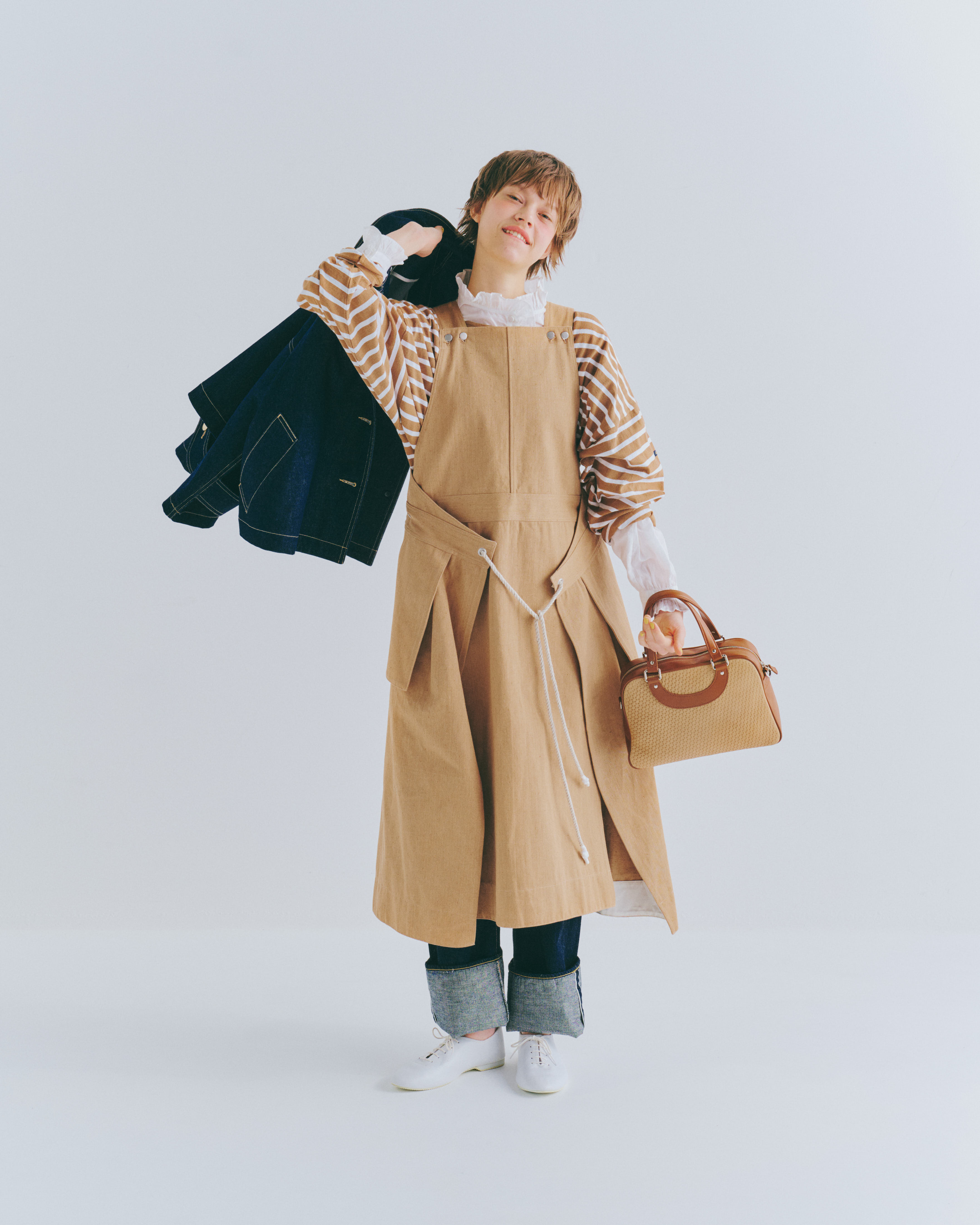 エプロンワンピースを主役にした、ちょっぴり素朴なレイヤードスタイル。ロールアップしたセルビッチデニムをちらりとのぞかせて、さりげないアクセントを添えるのを忘れずに。定番のボーダートップスも、フリルシャツをのぞかせれば、ワーク過ぎずチャーミングに仕上がる。足元はビットローファーで品よく整えて、さてと、ちょっとそこまで。