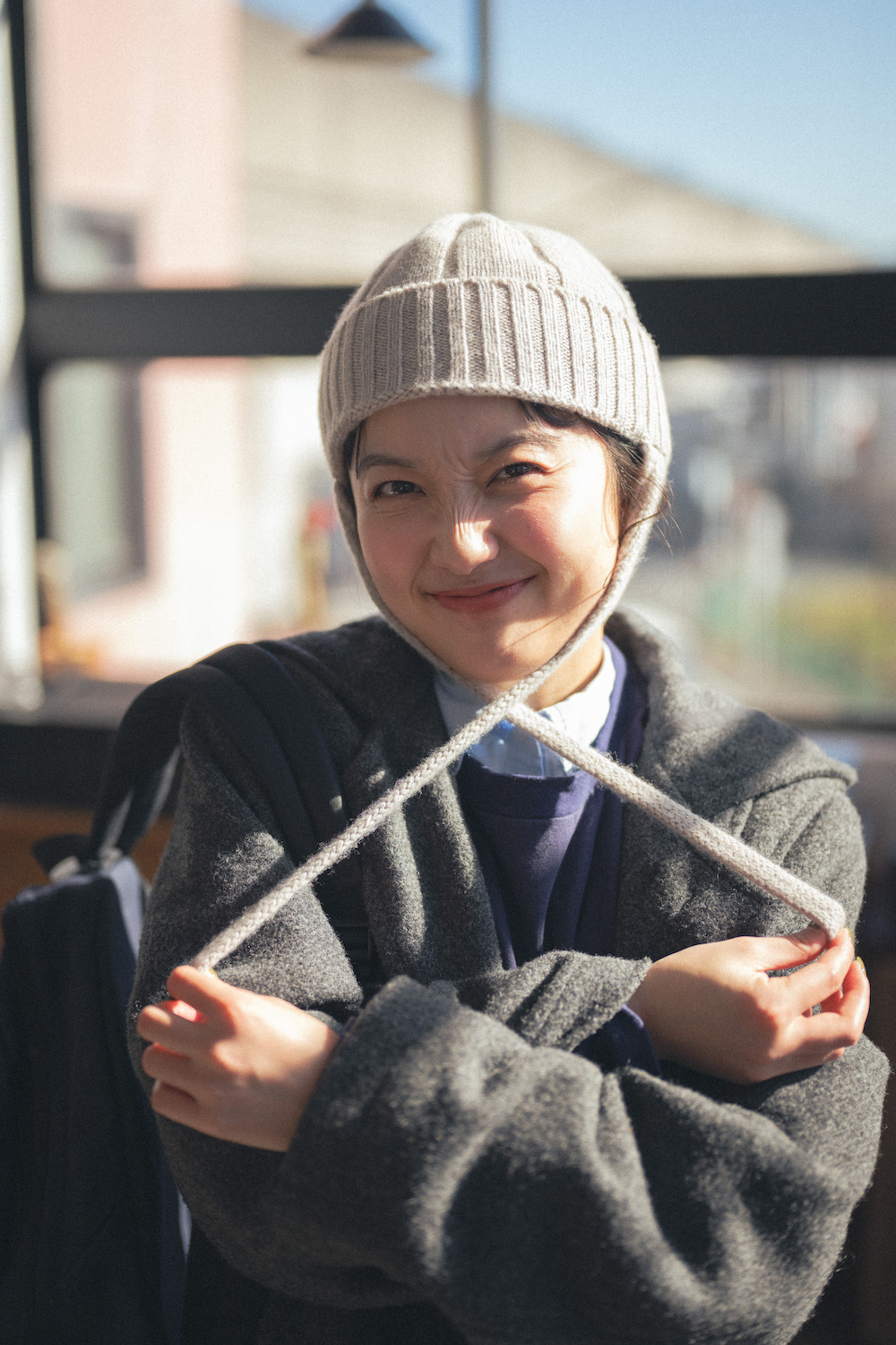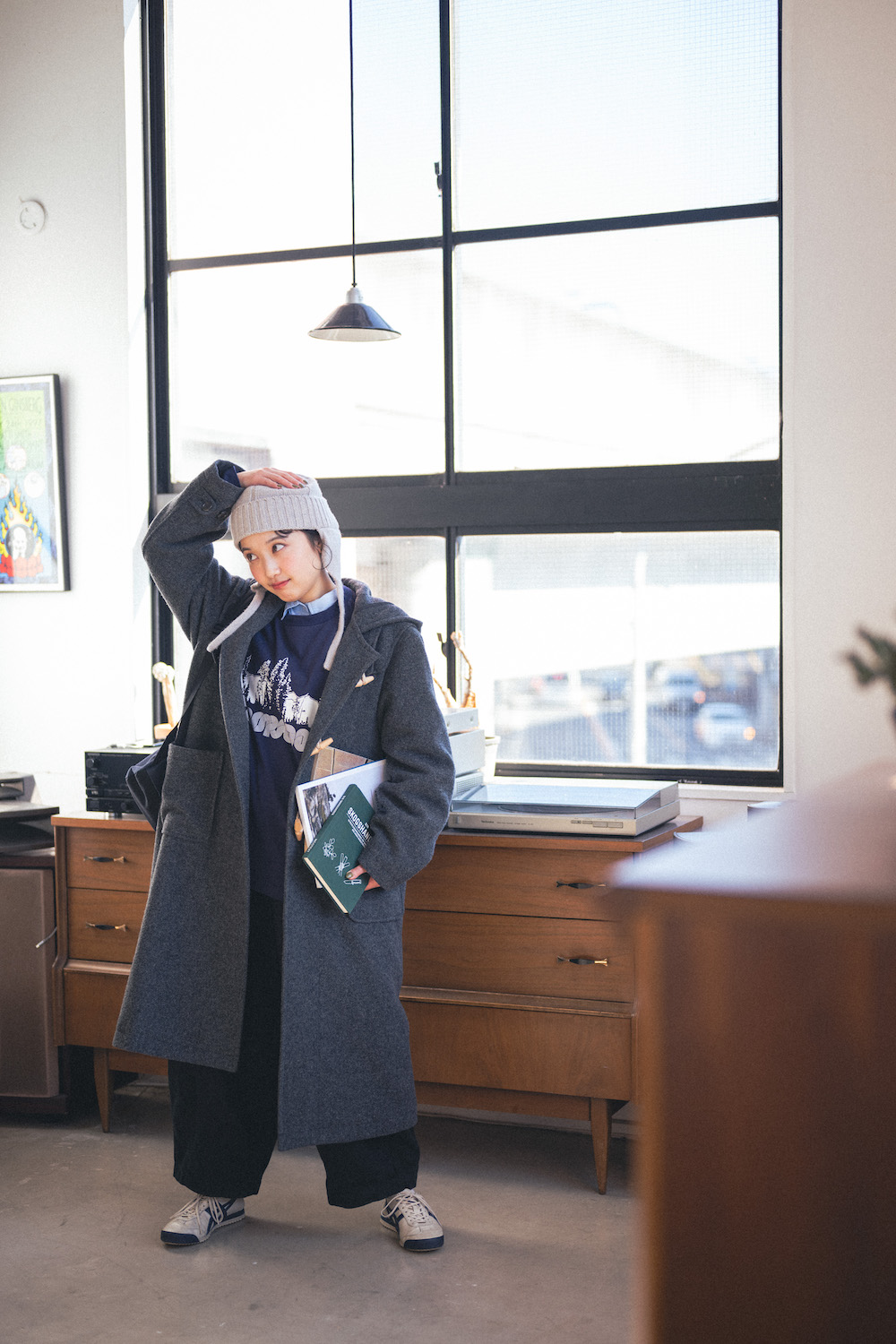 「ロングコートがどうしても重たく見えてしまう低身長のお悩みは、スマートなローテクスニーカーで足元をすっきりさせて解決!耳当てがついた《コージー》のニット帽は、冬の北海道旅行でも大活躍したほど暖かくてお気に入りです」