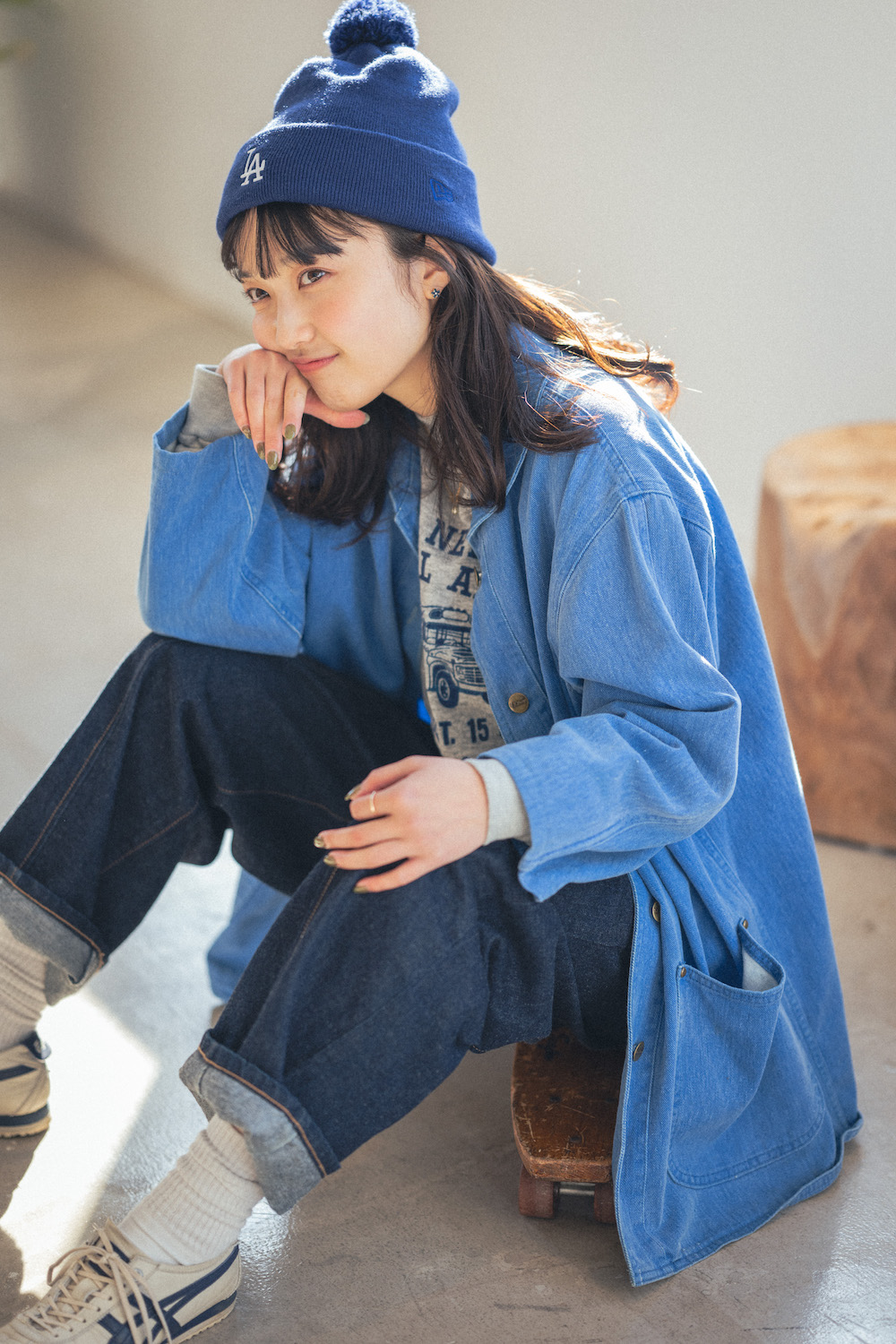 「濃淡の異なるブルーを合わせたデニムオンデニムスタイル。ゆったりしたサイジングの古着の《エルエルビーン》のジャケットがこなれ感を演出してくれます。ニット帽やスニーカーでとことんボーイッシュに」