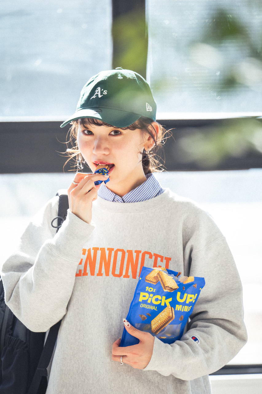 春にぴったりなホワイトのロングスカートは、スウェットでカジュアルダウンすると洗練された印象が際立つ。キャップやリュック、スニーカーでボーイッシュに味付けして、細部まで抜かりなく。