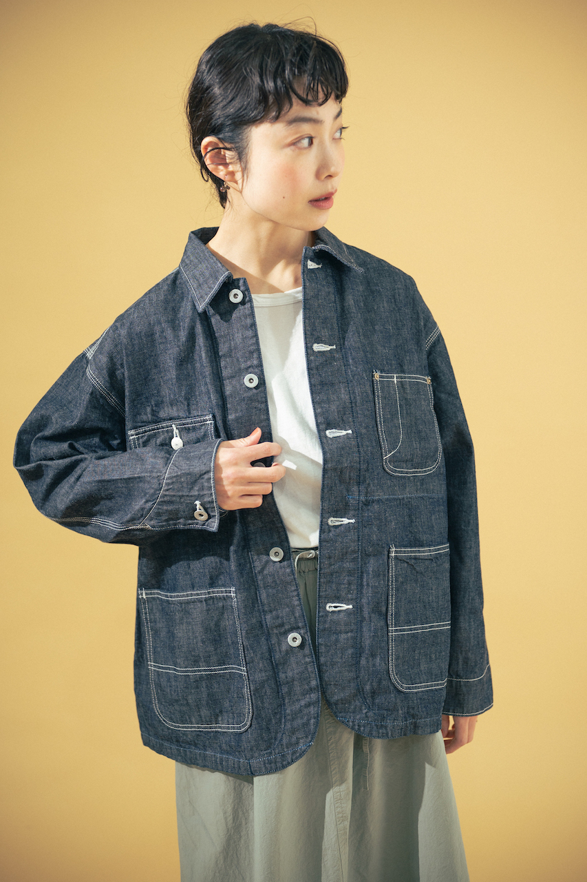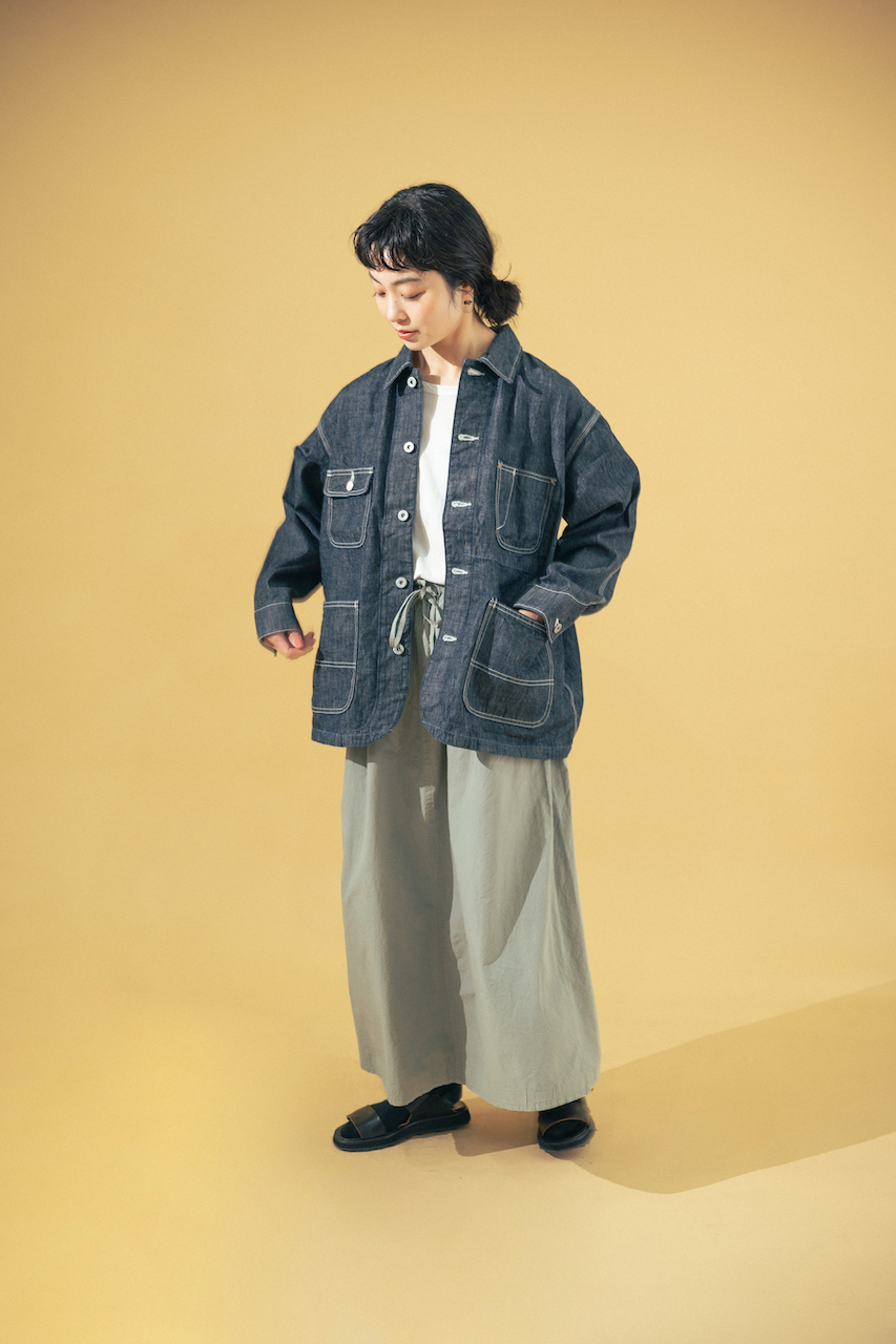 メンズライクな印象の大きめデニムジャケットは、ロングスカートを合わせると大人の女性も着こなしやすい。サンダル&ソックス合わせで春〜初夏への移ろいを足元でも演出しよう。