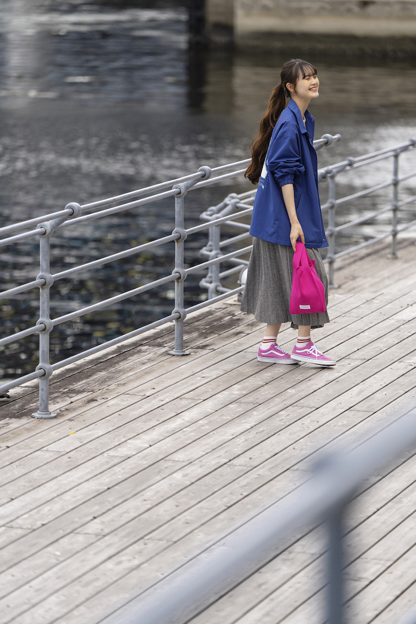 Tシャツ&プリーツスカートという女の子らしい装いは、スポーティな羽織りでハズして。ビビッドなブルーと対照的なピンクのバッグ&スニーカーを差し色にして、遊び心溢れる着こなしに。