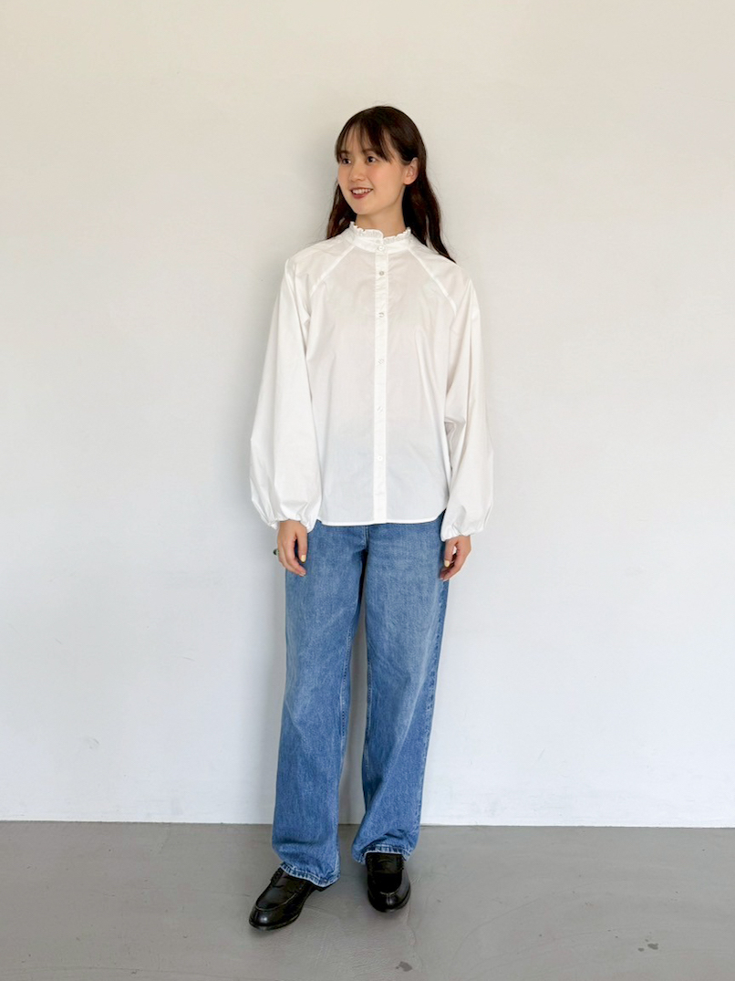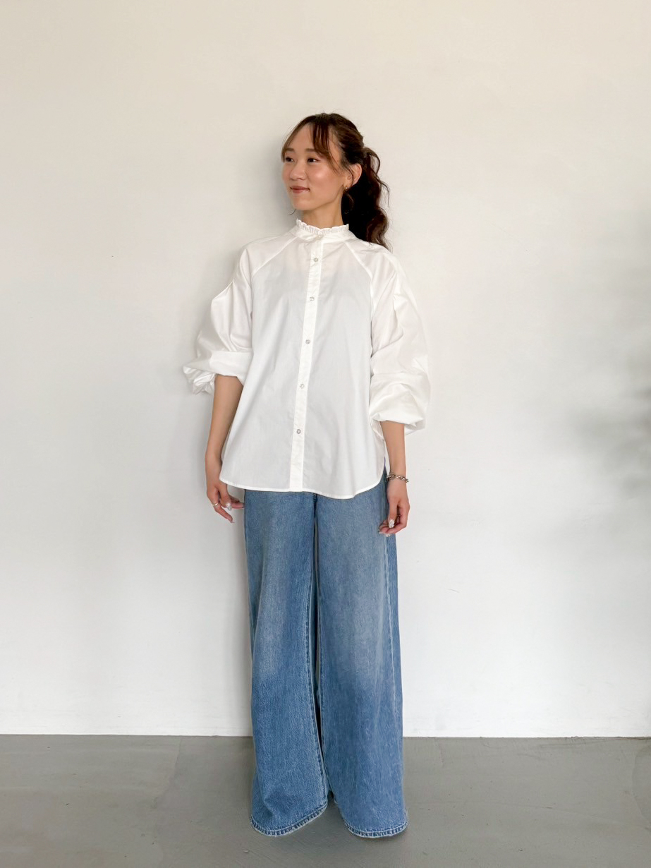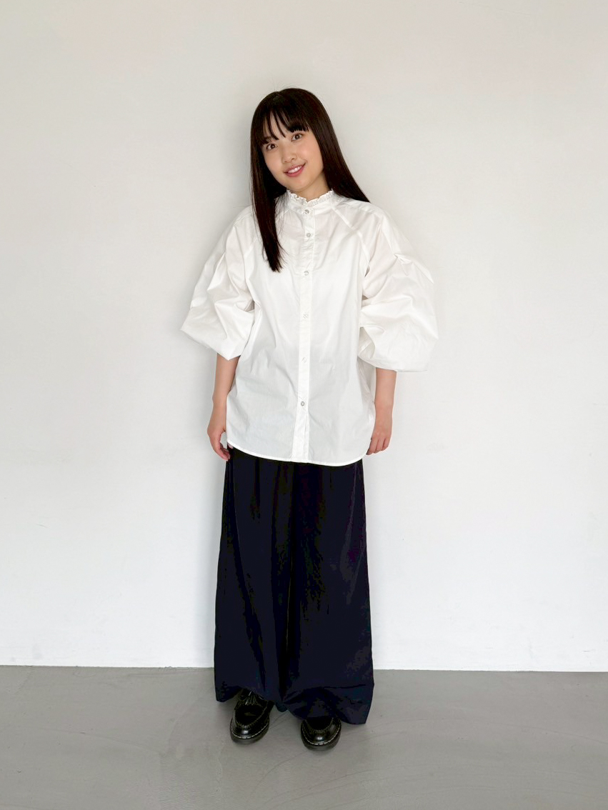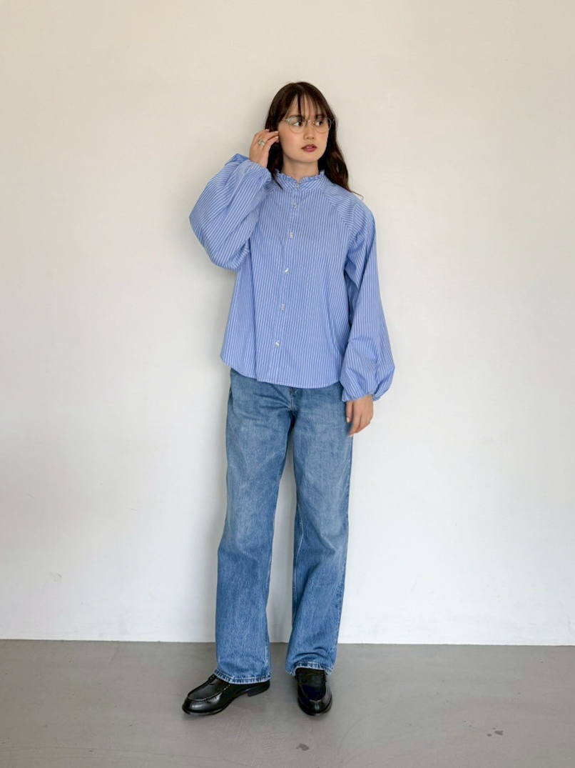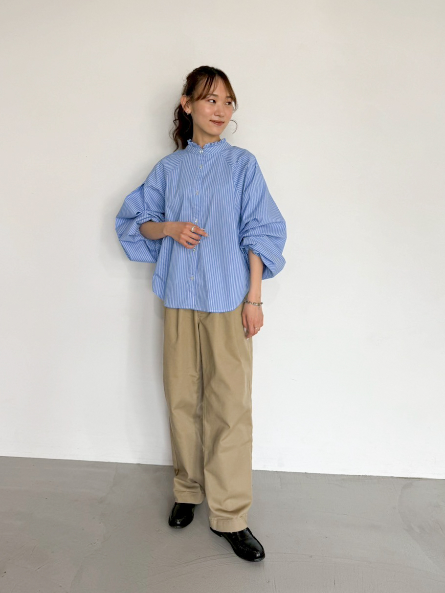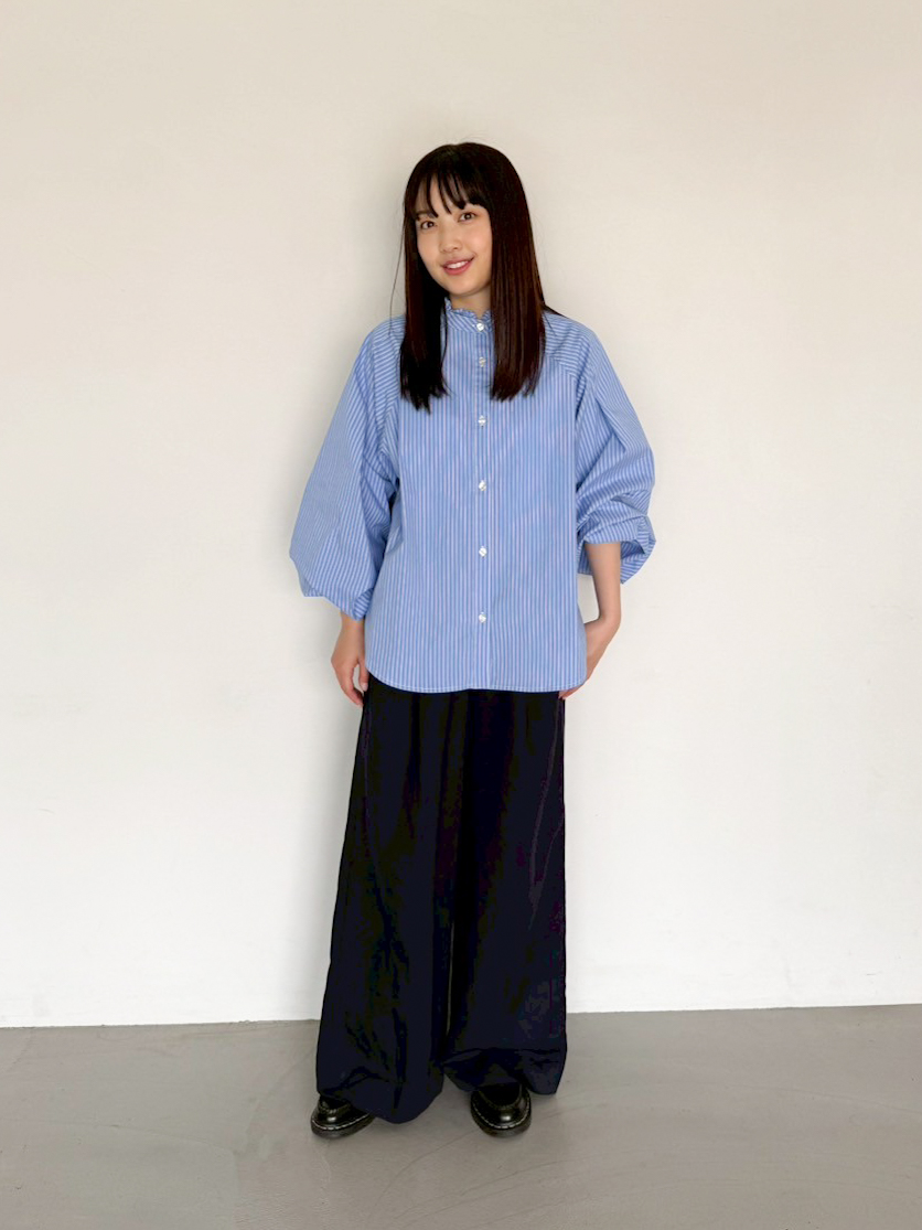 「Mサイズ(ブルーストライプ)は、169cmだとややコンパクトできちんとした印象に見えます。シャツの丸みのあるシルエットを楽しむならLサイズを選ぶのがおすすめです」