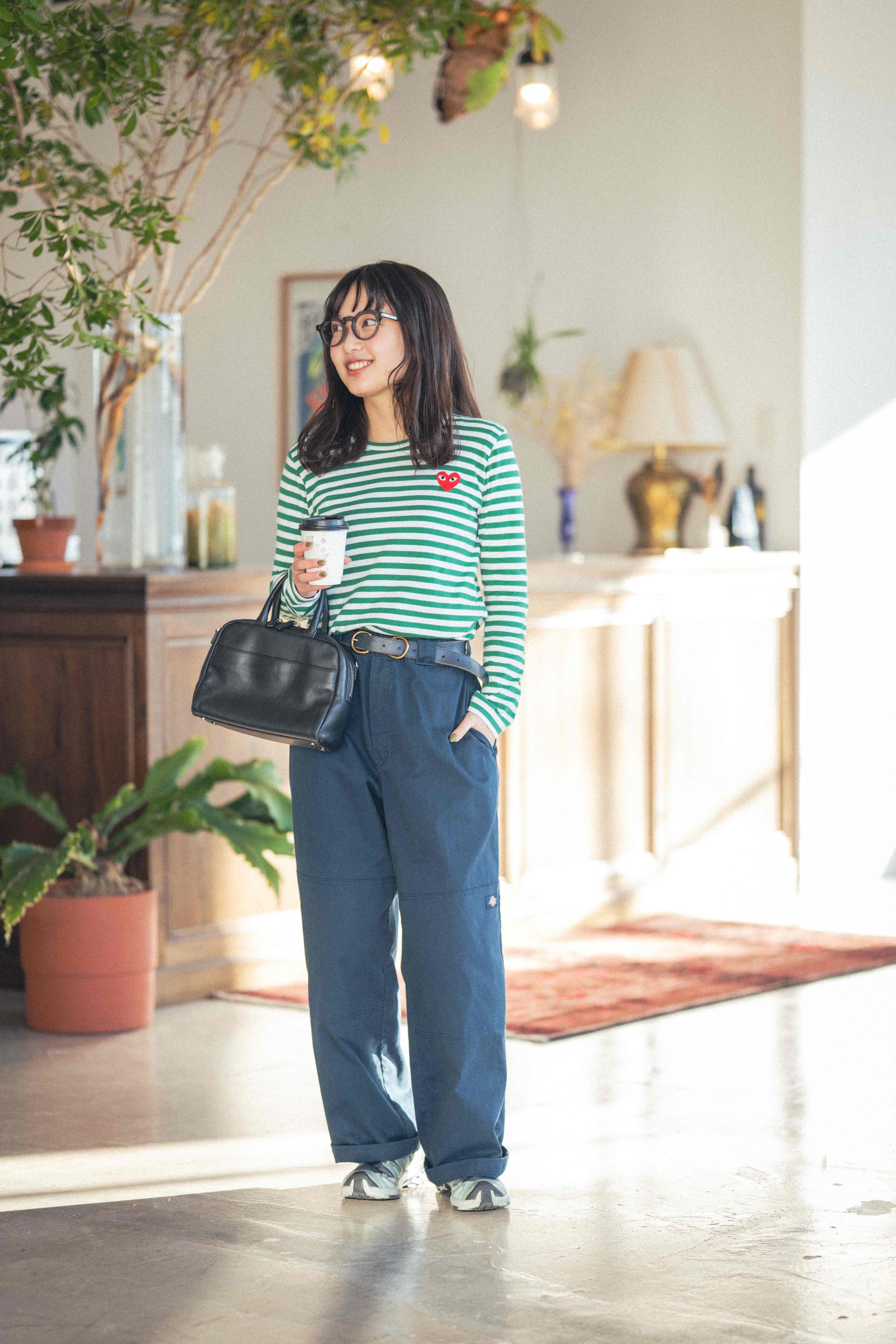 本人私物(シャツ/PLAY COMME des GARÇONS、パンツ/Dickies、シューズ/Salomon、バック/agnès b.、メガネ/PARIS MIKI)