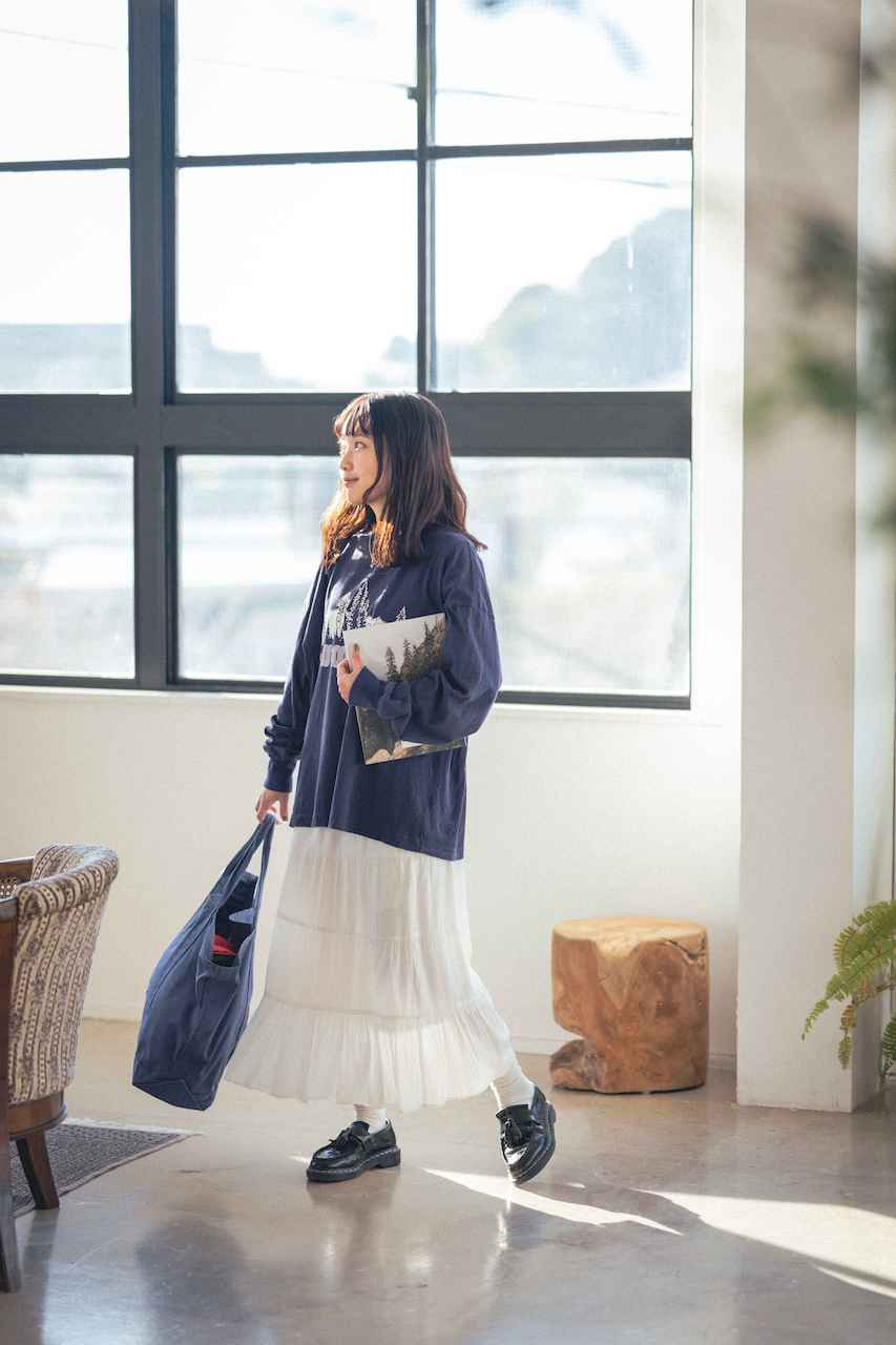 寒暖差のある初夏は、温度調節しやすいロンTが活躍! Tシャツのようにボトムを選ばないので、あえてガーリーなフレアスカートで愛らしいギャップを楽しむのもあり。