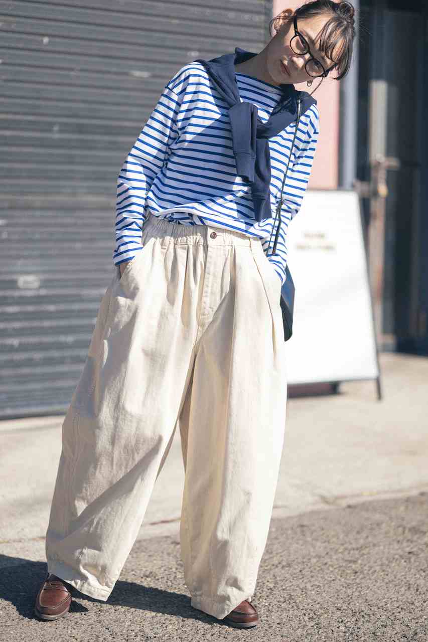 定番のボーダートップスはバルーンボトムでシルエットで遊びをプラス。全体をブルー&ホワイトで統一して初夏のマリンスタイルにアレンジ。品のある小物で引き締めよう。