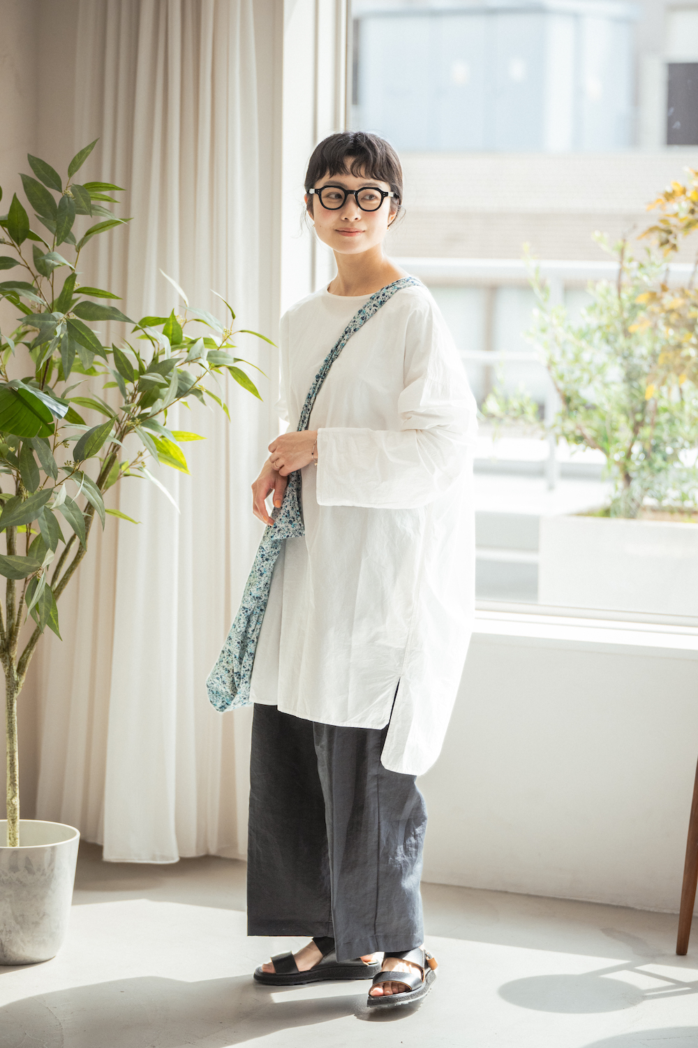 本人私物(チュニック、パンツ、サンダル、バッグ/すべてVeritecoeur、メガネ/PARISMIKI、ピアス/asumi bijoux)