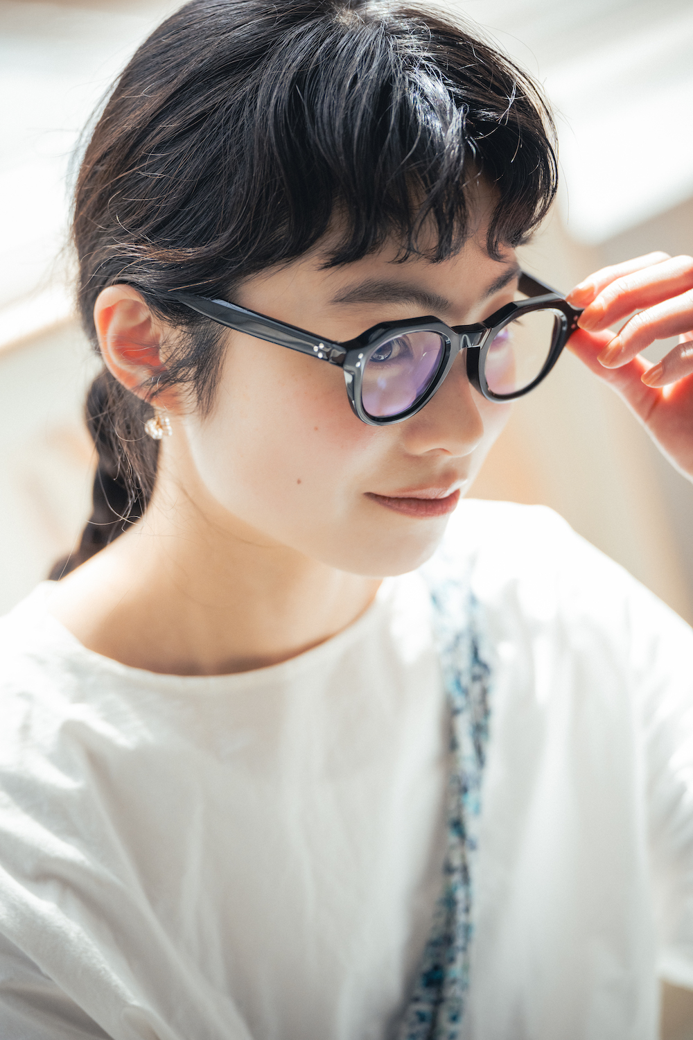 「シンプルでリラックス感のあるコーディネートをしたいときは、ライトな素材感の白いチュニックブラウスを主役に。ふだん子供と出かけるとき、こんな感じが多いかもです。モノトーンにすればラフになりすぎないからおすすめ。《パリミキ》のメガネはコーディネートが締まるのでシンプルな装いのときに使うことが多いです」