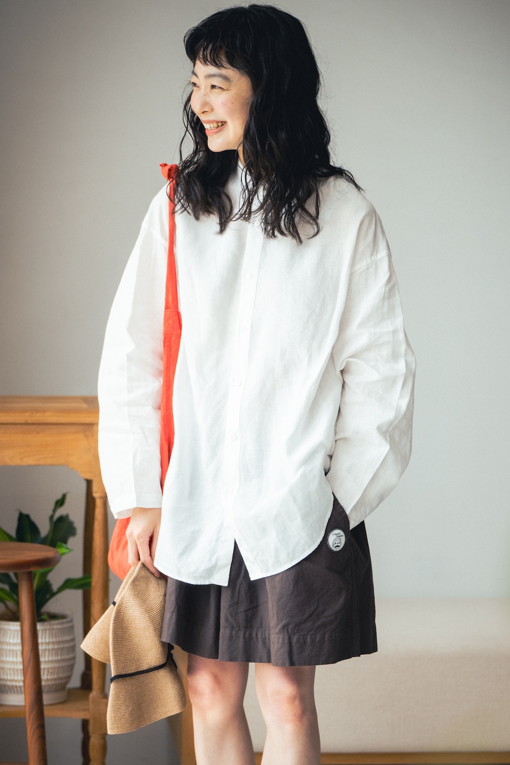 「真夏はついついショートパンツにトライしたくなります。そんなとき気を付けるのは子供っぽくならないようにということ。ゆったりとした長袖のシャツを選んでみたのだけれど、どうですか?リネン素材のシャツは夫と兼用のお気に入りです 」