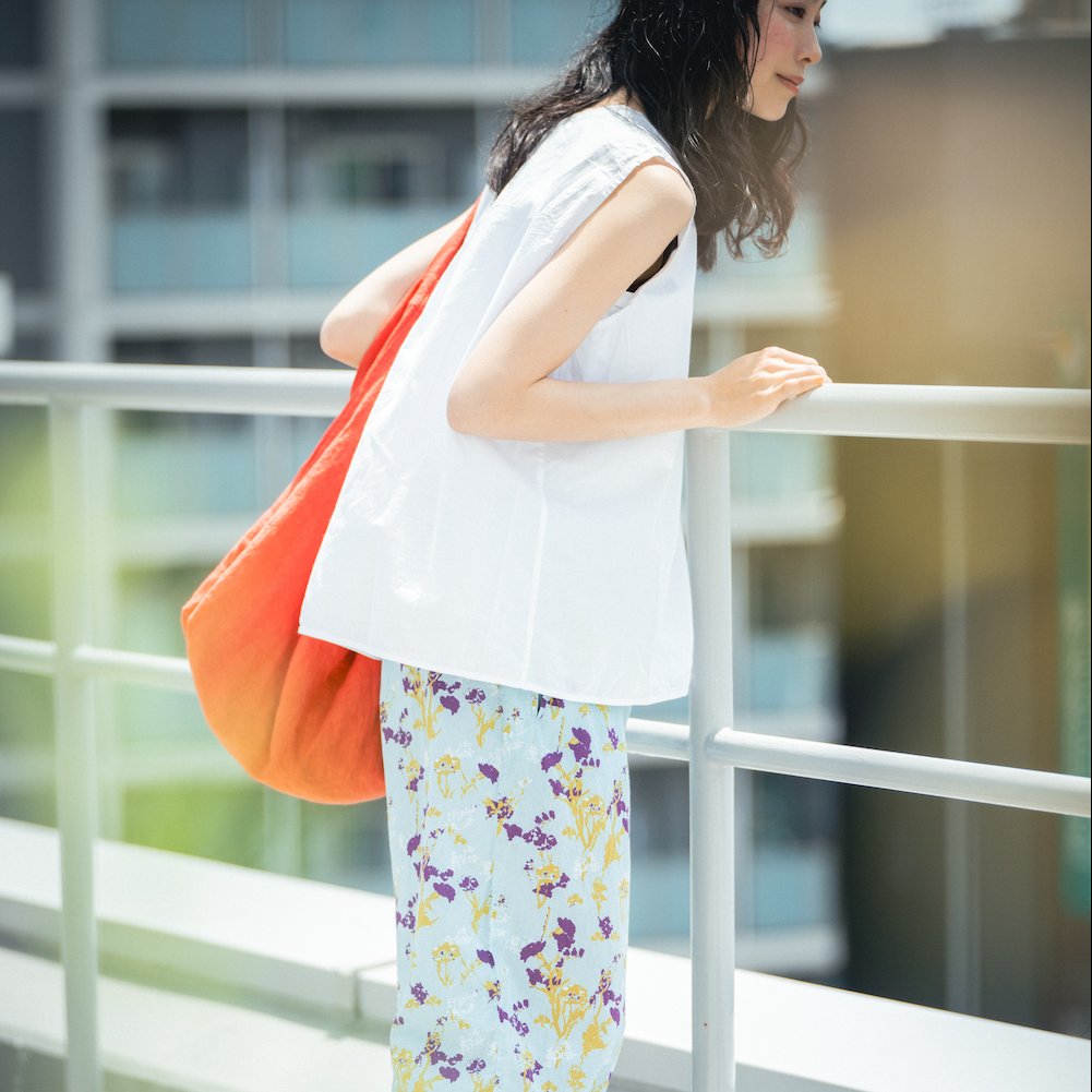 「さらりとした素材が着心地最高なブルーの総柄オールインワンは、同柄のバッグを一緒に持つのがかわいいと思っていて。柄”増し増し”で着ると、見た目だけでなく気分まで華やぐんです。首元から白のインナーを出して、ちょっと抜け感をつけるのがポイント。足元はベージュを選んで軽やかに仕上げます」