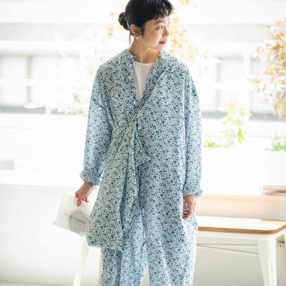 「ブルーのプリントパンツ×白ブラウスの、この季節らしい涼感のあるコーディネートです。ブラウスはインナーにも一枚でも着られる万能アイテム。首の詰まった形もタイプです。実はとってもベーシックな着こなしだから、おとなしい印象で終わらないように柄を投入。クール感のあるブルーのワイドパンツなら。大人っぽく着られるのかなぁと思っています。足元はサンダルにして抜け感を」