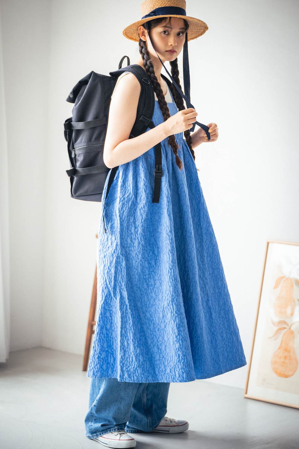 「あまりに暑いのでせめて着こなしだけでも……と、今日はサックスブルーを主役に爽やかにまとめました。ワンピースはそのまま着てもカワイイんですが、今日はチュニック感覚でレイヤードして、下にデニムをのぞかせています。ストローハットで季節感を、コンバースで抜け感をつけると、涼感がアップします。Aラインワンピースにはリュックを合わせると、シルエットのバランスが取れる気がしています」