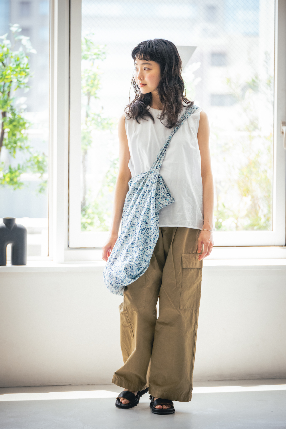 「夏は、カーゴパンツを着る日に白いノースリーブトップスを合わせる日が多くなります。カジュアルなムードはそのままに、涼し気で軽やかになる気がするんですよね。花柄のバッグを合わせると、ボーイッシュになりすぎず、いいバランスなんじゃないかなぁと思っています」